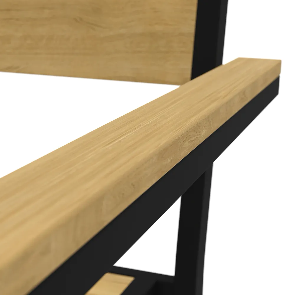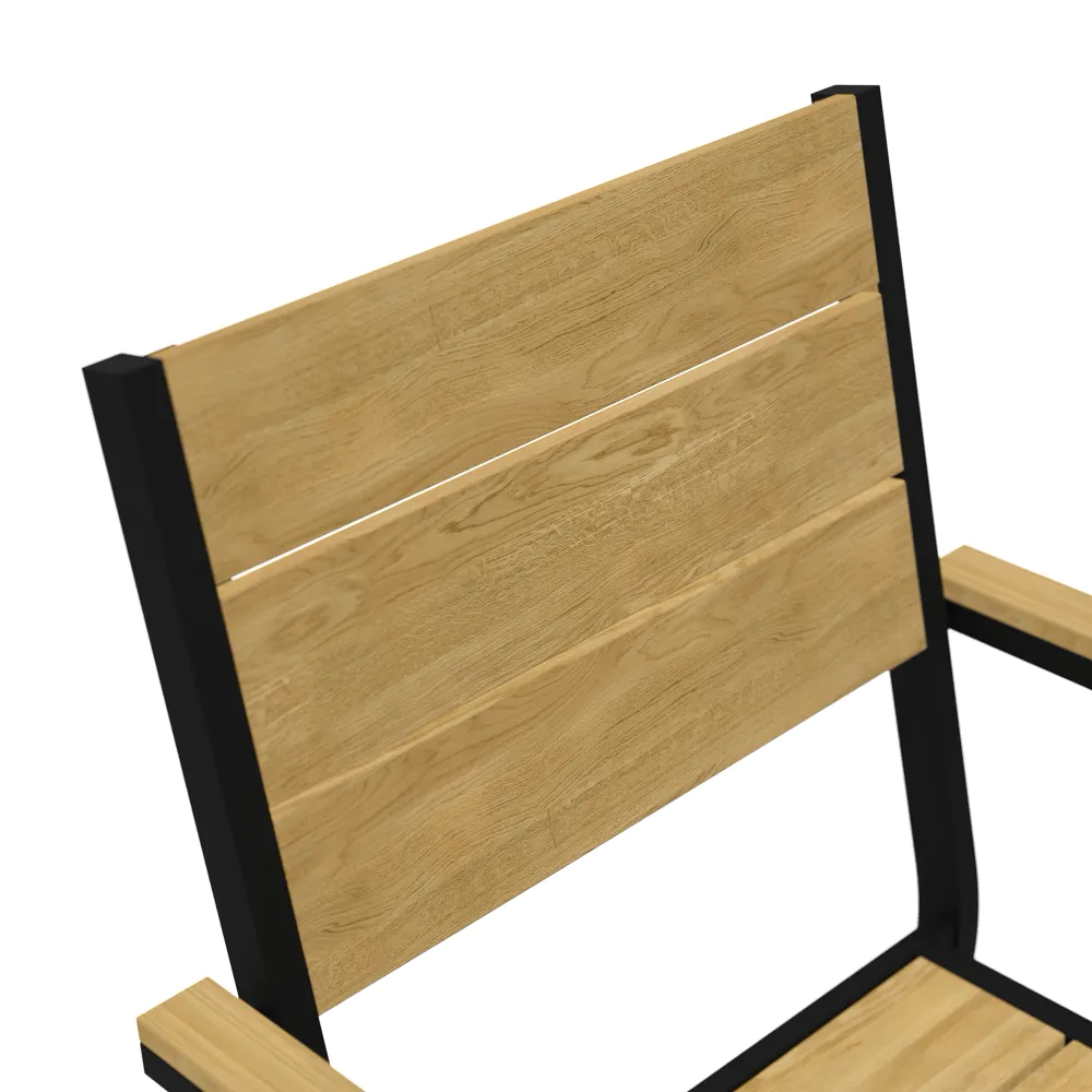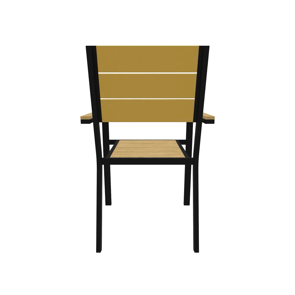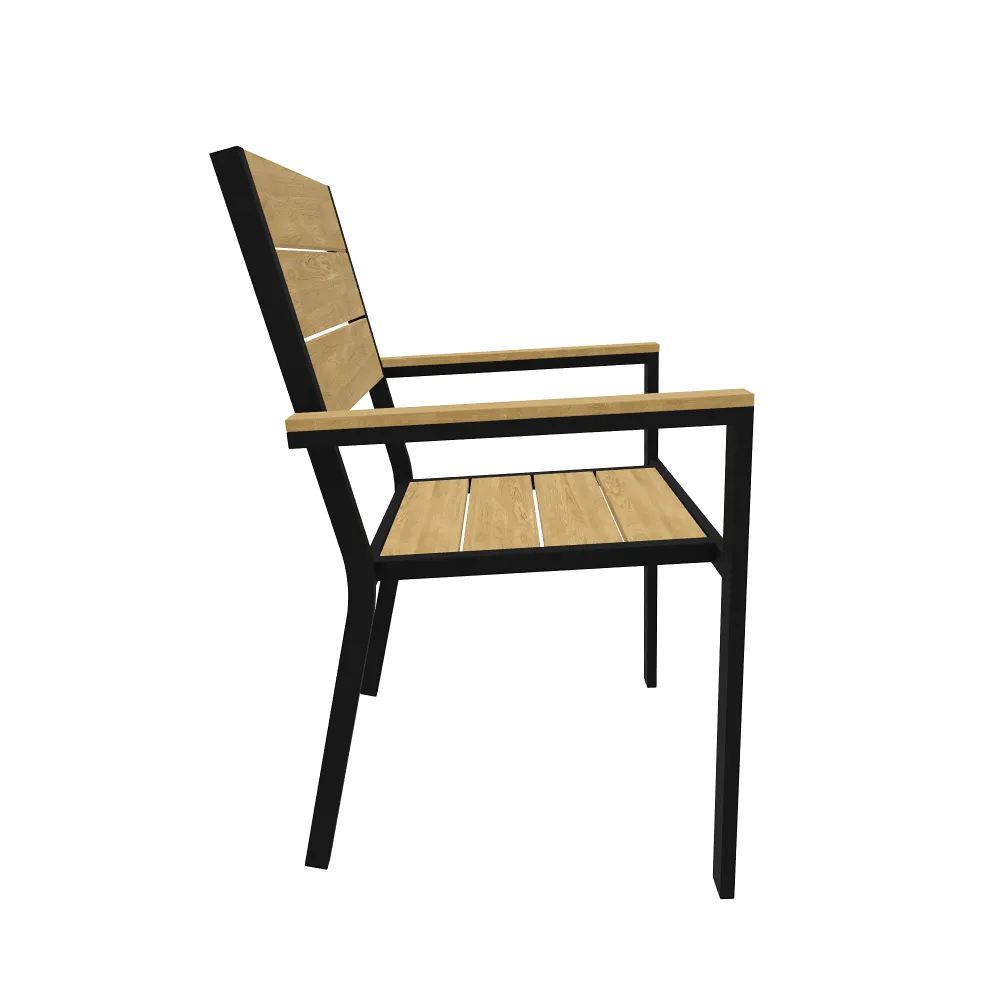 Elegante e robusta, la sedia Camir è progettata per vivere all'aperto. La sua struttura in tubolare metallico sostiene con leggerezza doghe in polywood nero, un materiale all'avanguardia che unisce il fascino estetico del legno sbiancato alla praticità dei polimeri moderni.