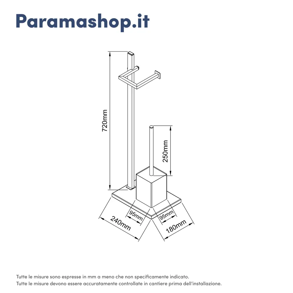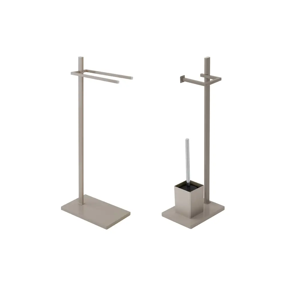 Questa serie si compone di una piantana portarotolo e portascopino e di una portasciugamani, entrambe in acciaioinossidabile con una base in legno MDF con colorazione tortora.