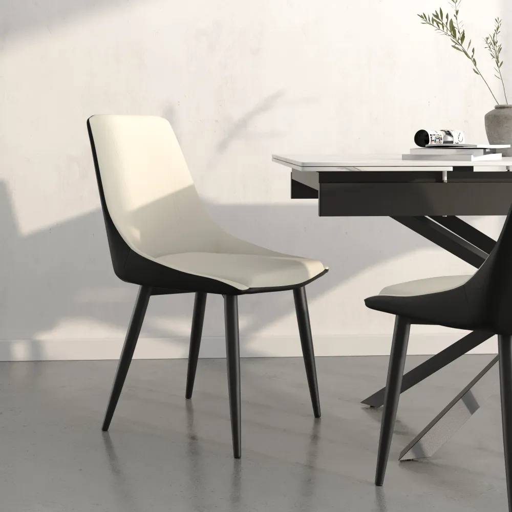 La sedia Clelia è l’elemento ideale per dare un carattere unico alla tua casa. La sua seduta in similpelle bicolore combina eleganza e comfort: il beige sul davanti e il nero sul retro creano un effetto sofisticato, perfetto per lunghe cene o momenti di lavoro.