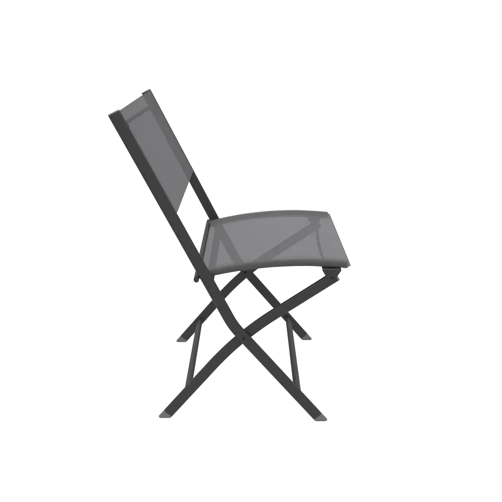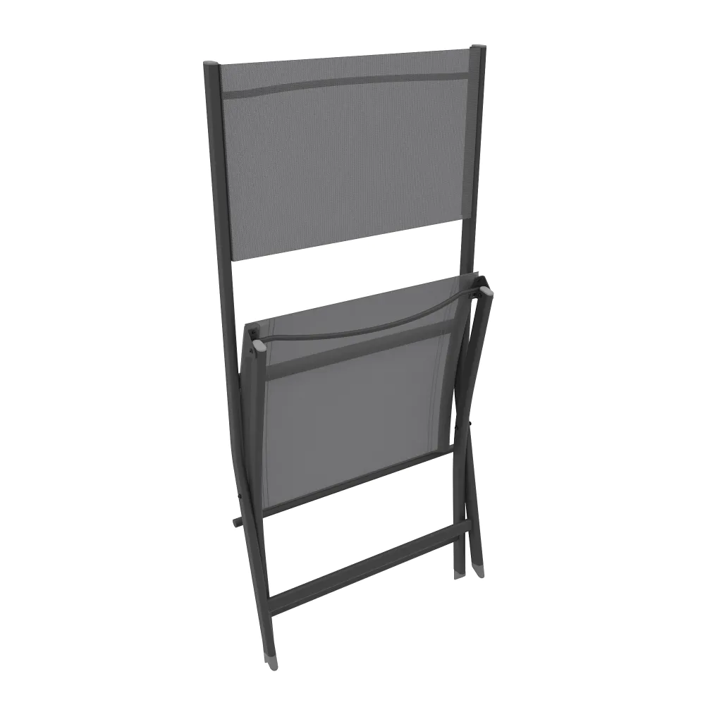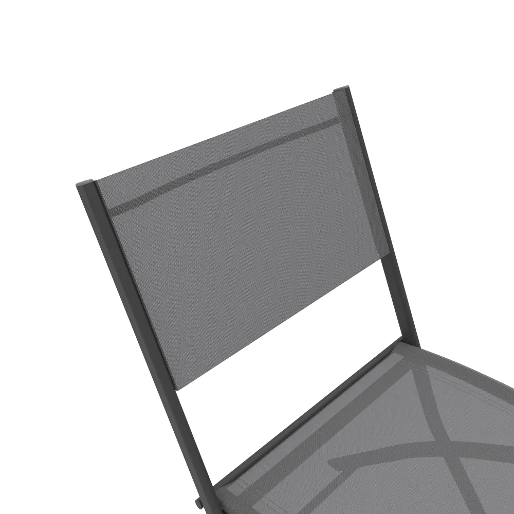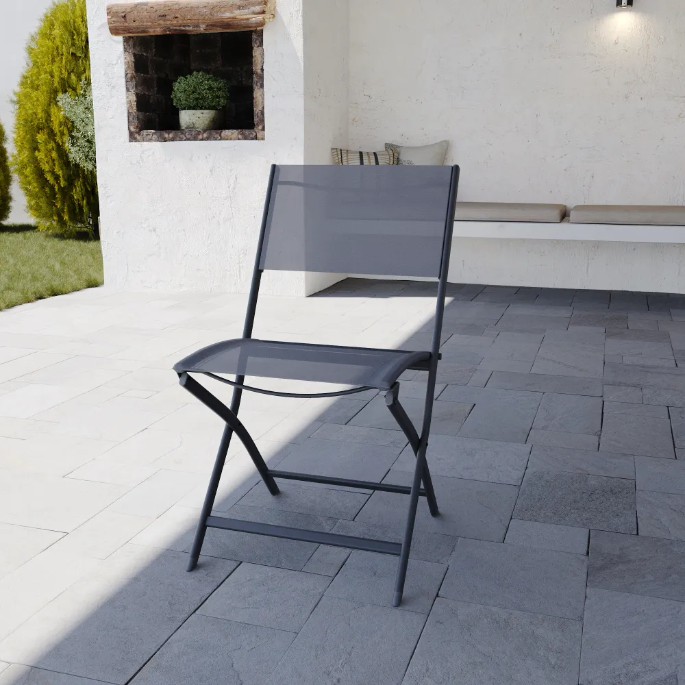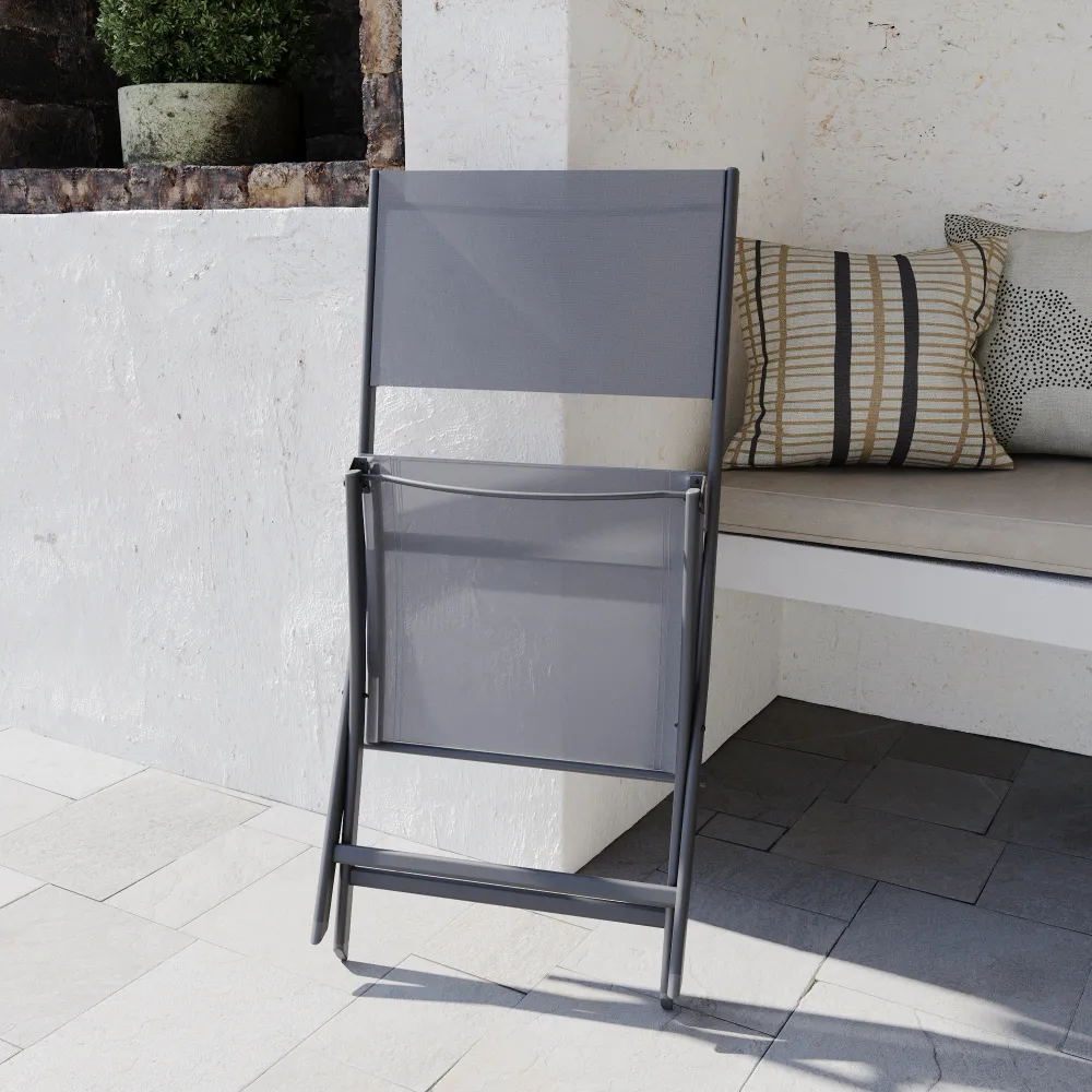 Il design è valorizzato dalla tonalità in textilene grigio scuro, un colore sobrio e moderno che maschera efficacemente lo sporco e resiste allo sbiadimento causato dal sole. La trama tecnica garantisce una seduta traspirante, facile da pulire e pronta all'uso in ogni stagione. Con Yalia, la funzionalità "salvaspazio" non rinuncia mai all'eleganza.