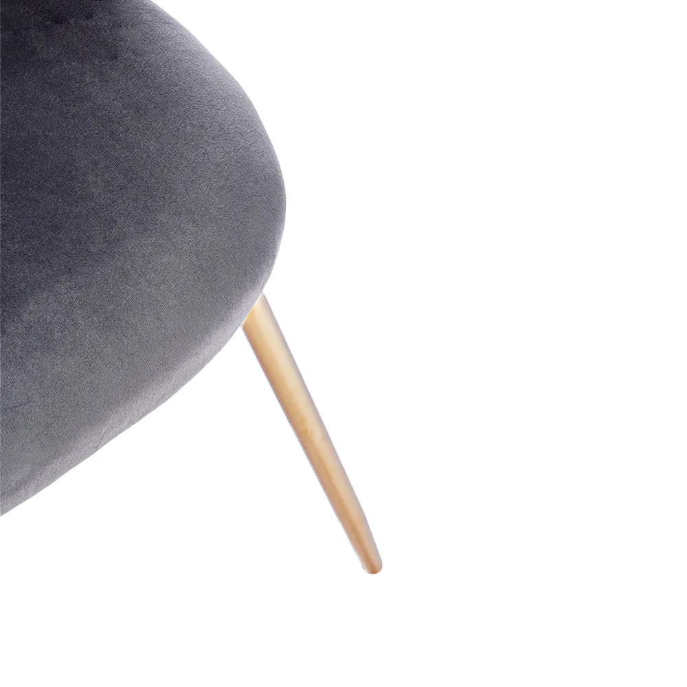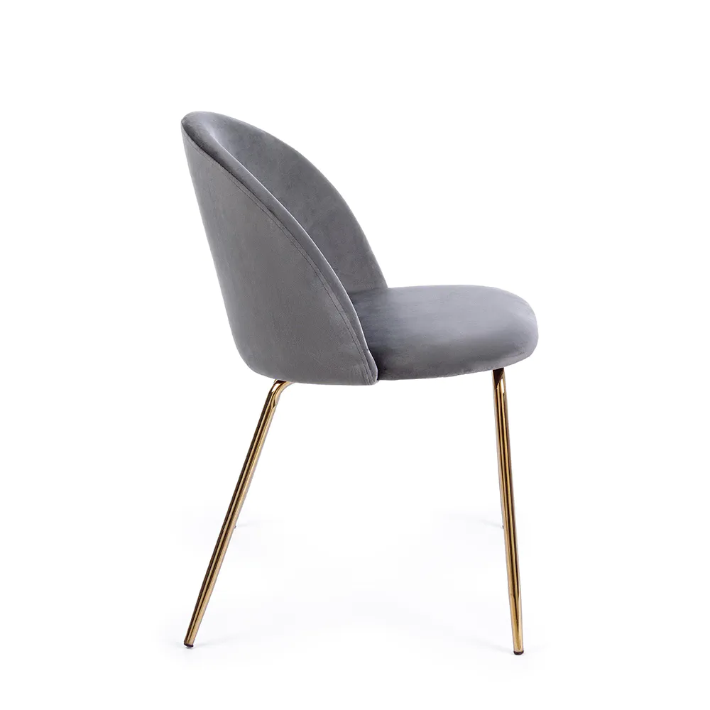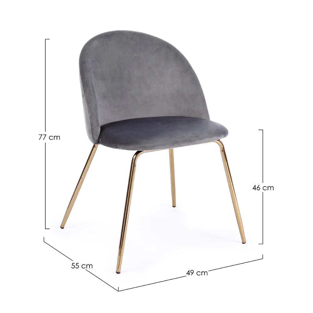 La seduta e lo schienale imbottiti in schiuma poliuretanica garantiscono un comfort ottimale, mentre il rivestimento in tessuto effetto bouclè colore grigio scuro (95% poliestere e 5% acrilico) dona un aspetto morbido e ricercato. Le gambe in tubolare di acciaio con finitura dorata aggiungono un tocco glamour, assicurando al contempo stabilità e resistenza.