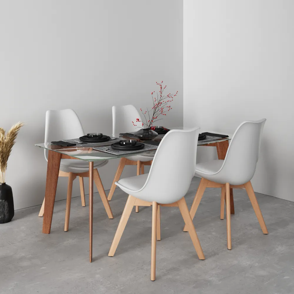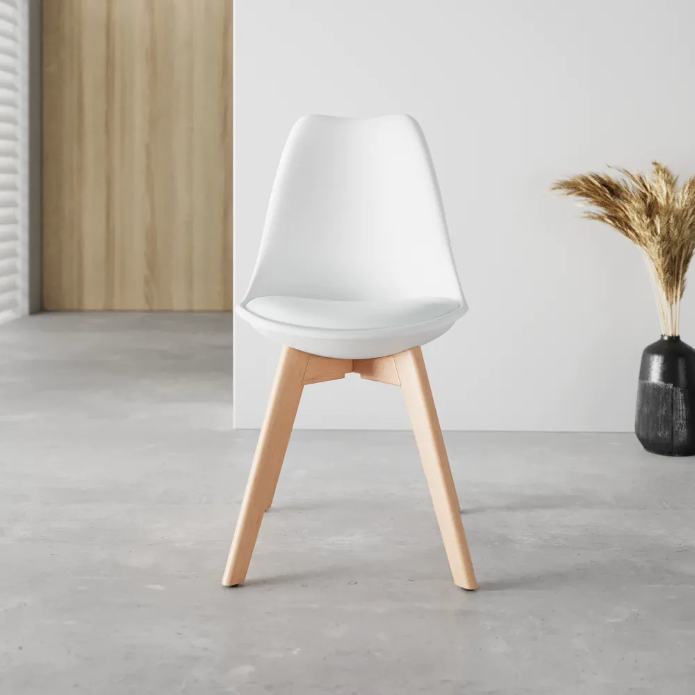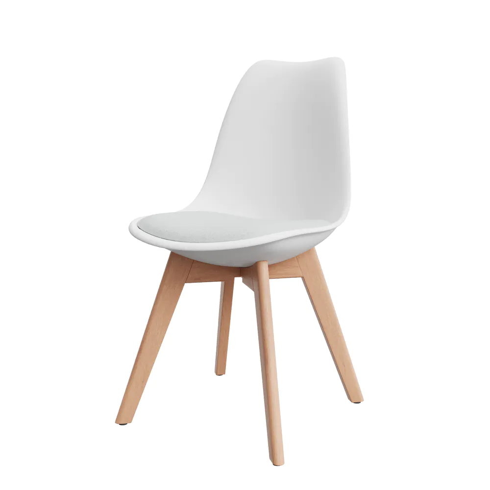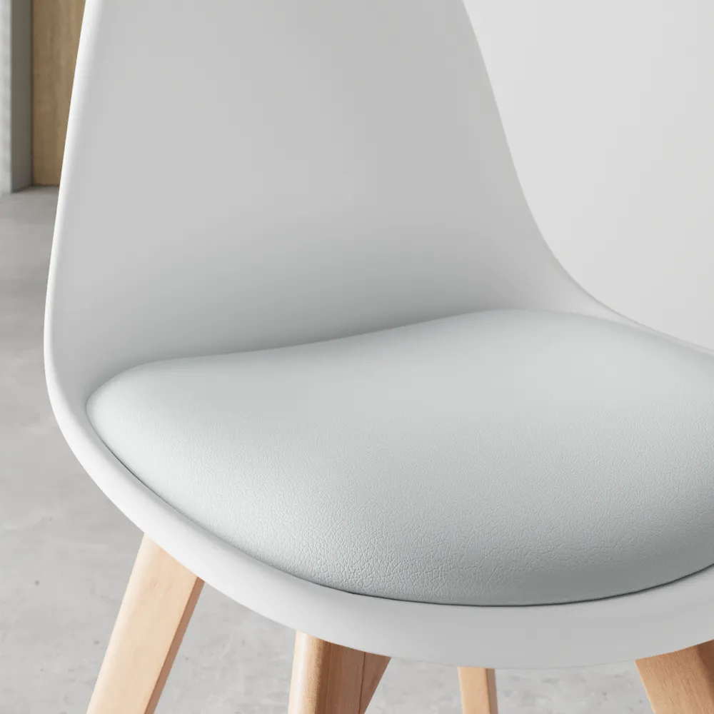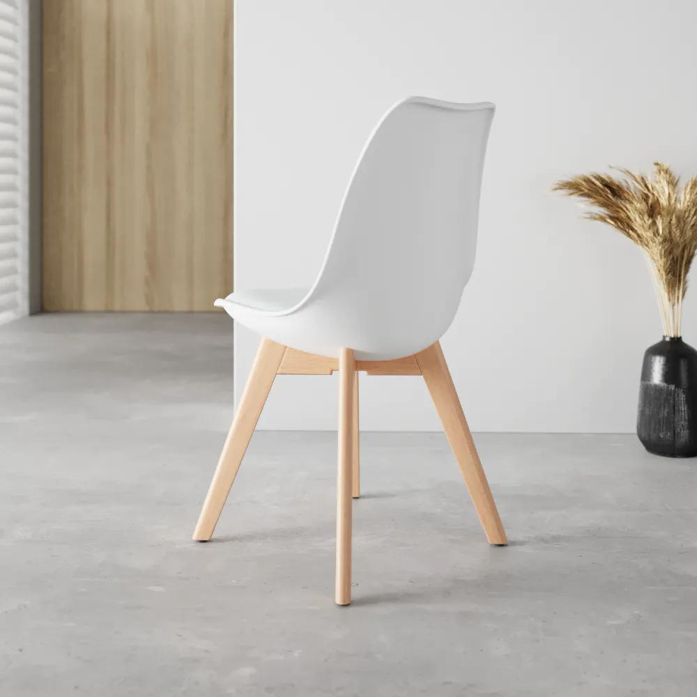 La seduts in polipropilene bianca si abbina perfettamente alle gambe in legno di faggio, creando un look sofisticato che si integra in ogni ambiente. La vera differenza sta nel cuscino della seduta, un morbido inserto in schiuma di poliuretano che garantisce un comfort eccezionale anche per le cene più lunghe.