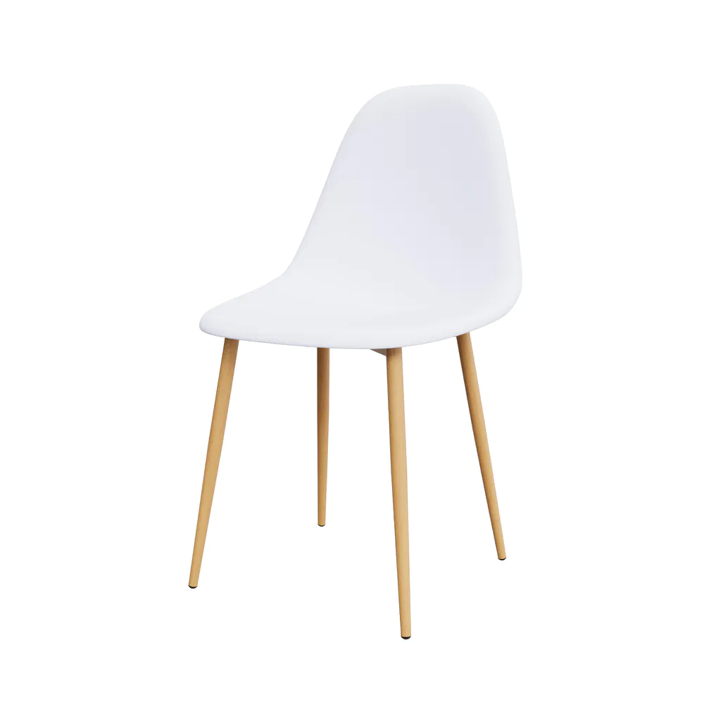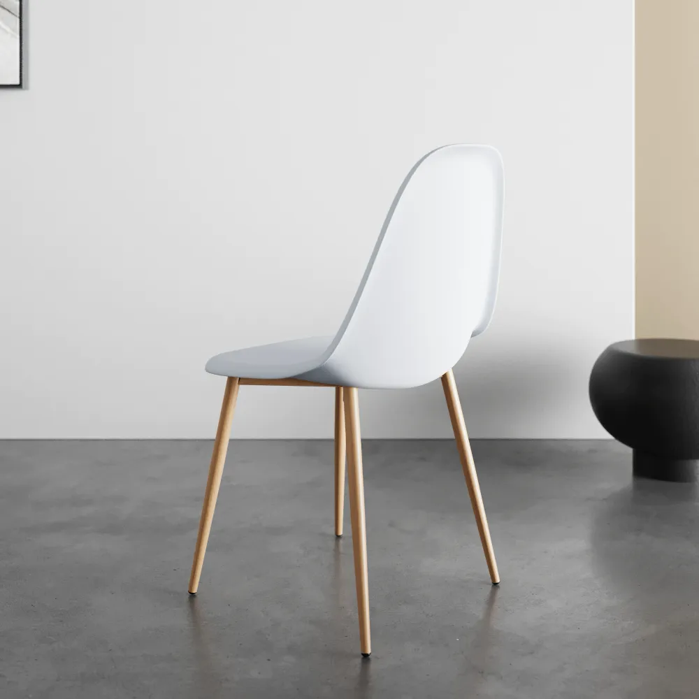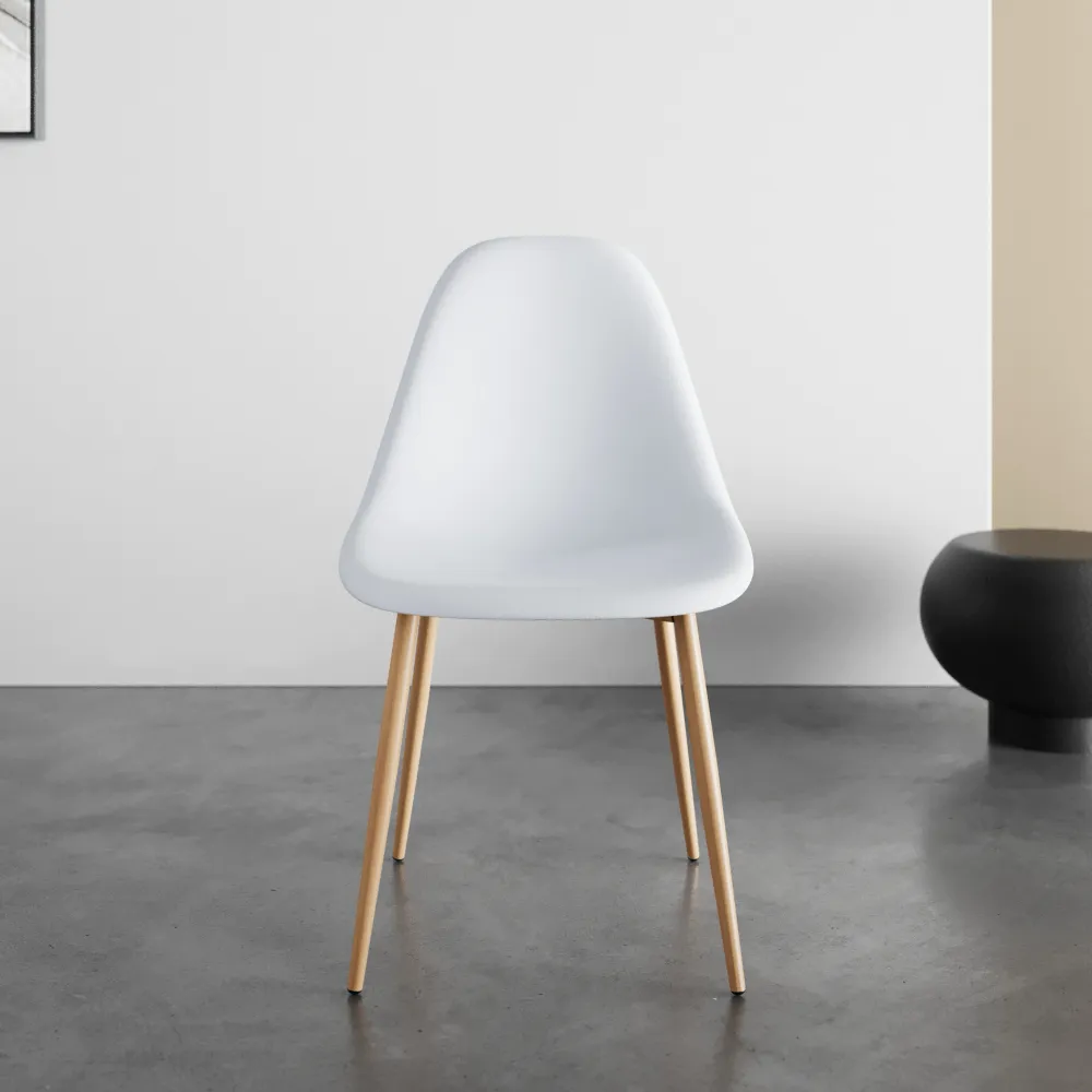 La seduta in polipropilene bianca dona un aspetto sobrio ed elegante, facile da pulire e pensata per accompagnarti a lungo nel tempo. Le gambe effetto legno portano un tocco naturale e accogliente, mentre i piedini neri garantiscono stabilità e protezione al pavimento, aggiungendo un dettaglio di design moderno.