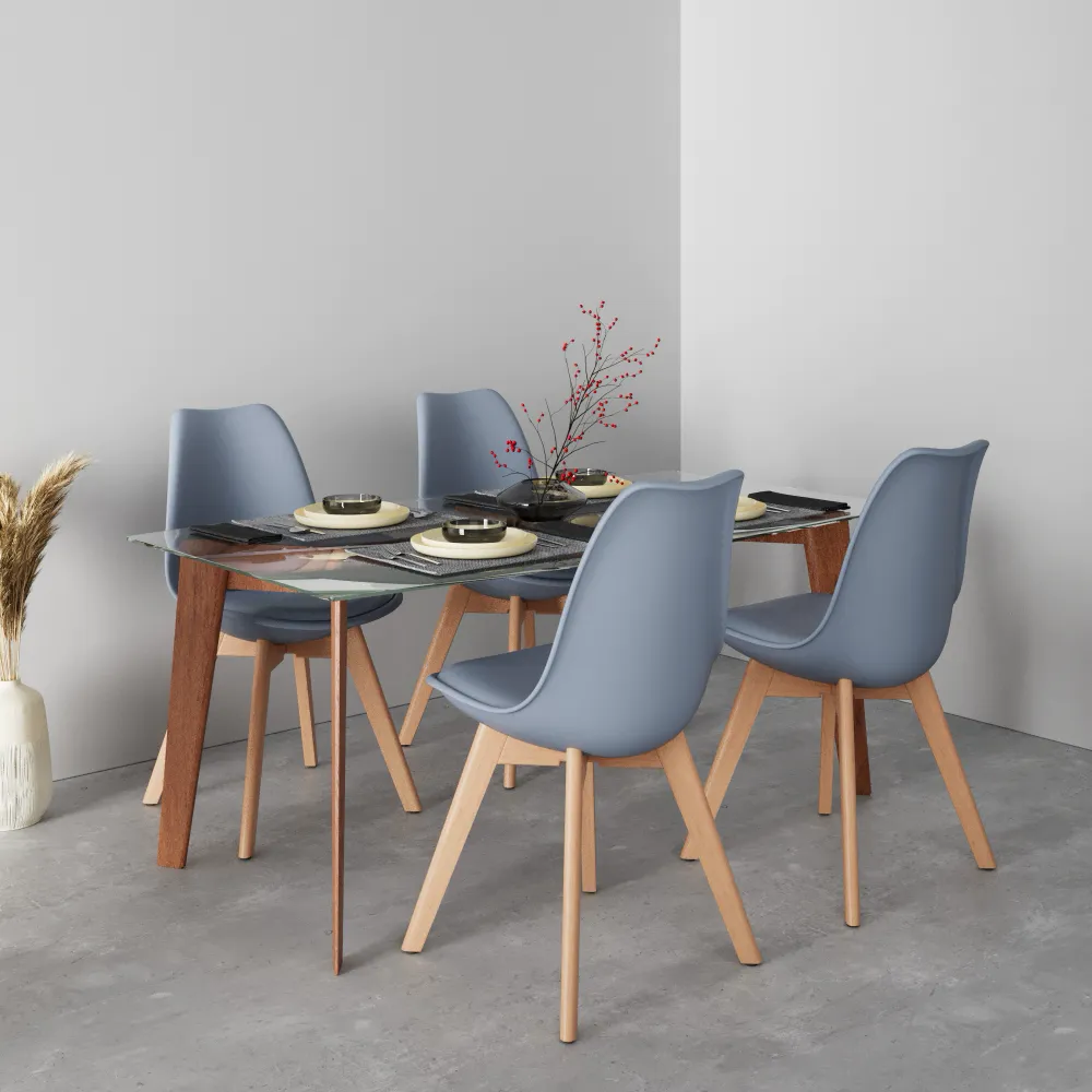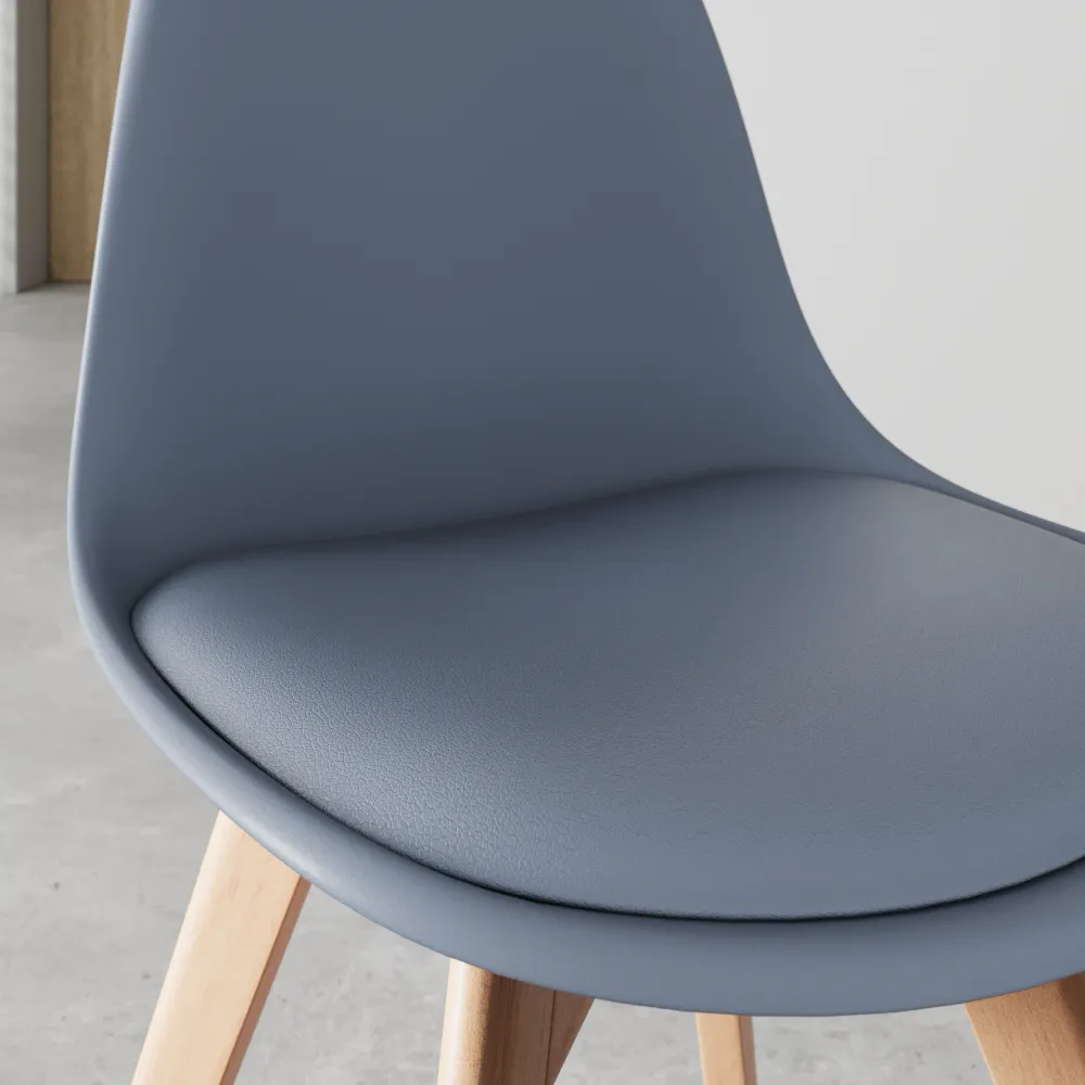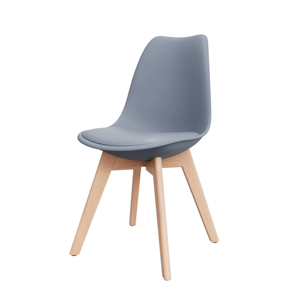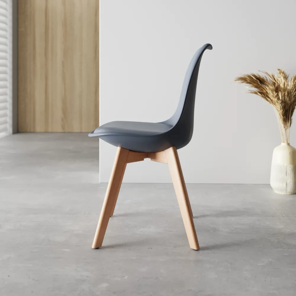 La seduta in polipropilene grigia si abbina perfettamente alle gambe in legno di faggio, creando un look sofisticato che si integra in ogni ambiente. La vera differenza sta nel cuscino della seduta, un morbido inserto in schiuma di poliuretano che garantisce un comfort eccezionale anche per le cene più lunghe.