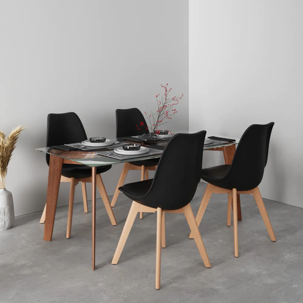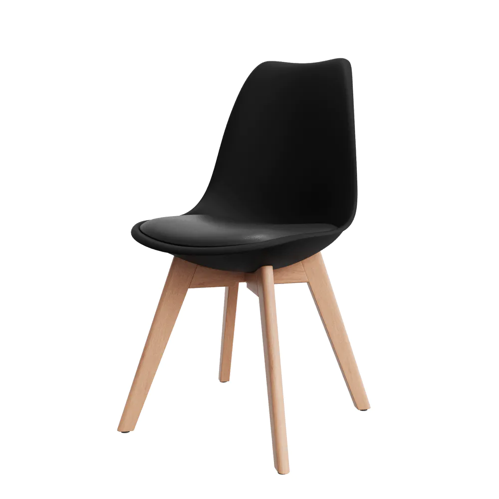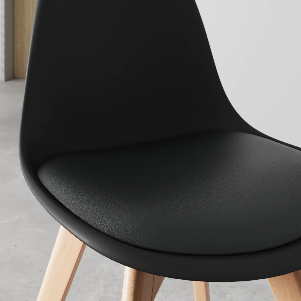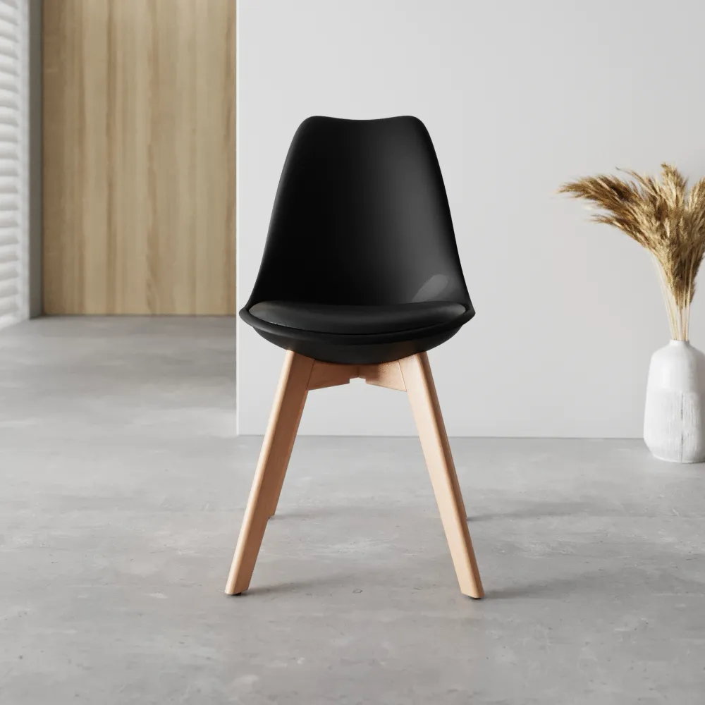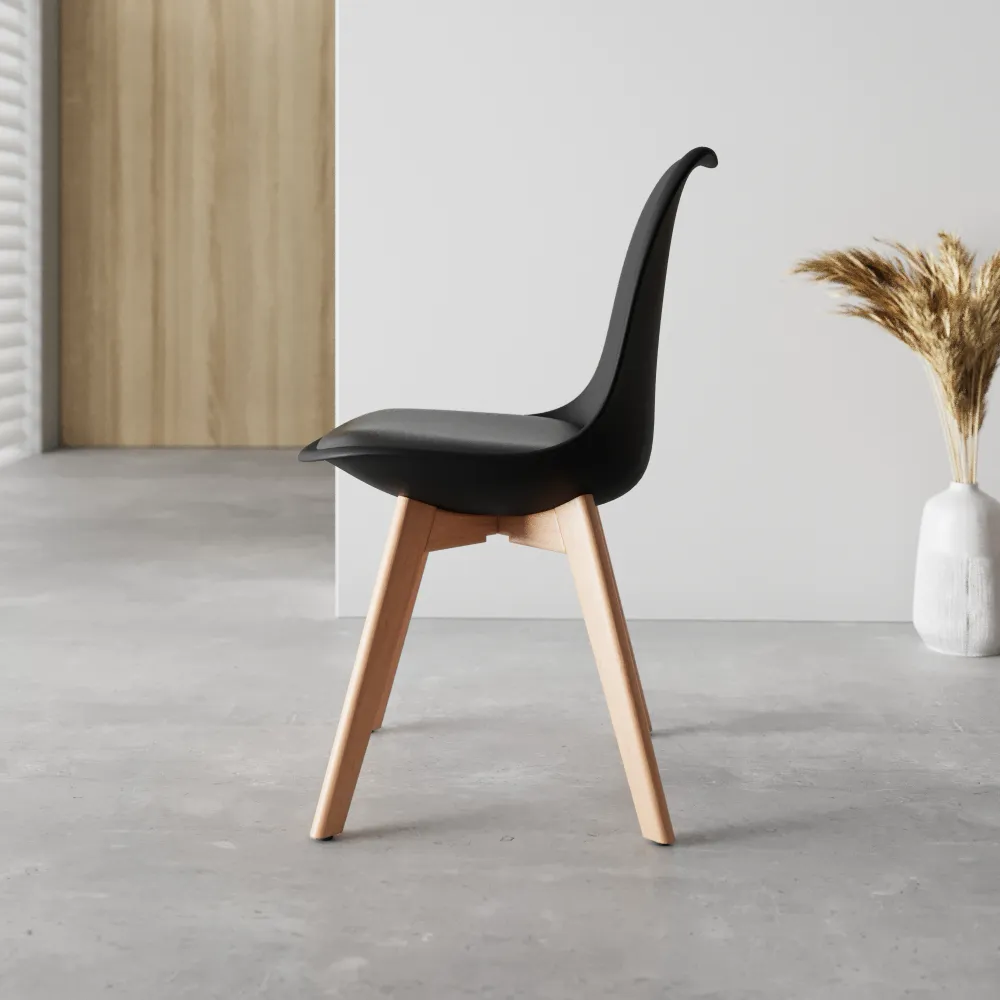 La seduta in polipropilene nera si abbina perfettamente alle gambe in legno di faggio, creando un look sofisticato che si integra in ogni ambiente. La vera differenza sta nel cuscino della seduta, un morbido inserto in schiuma di poliuretano che garantisce un comfort eccezionale anche per le cene più lunghe.