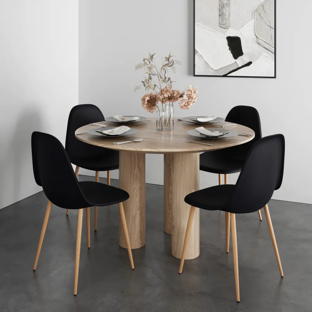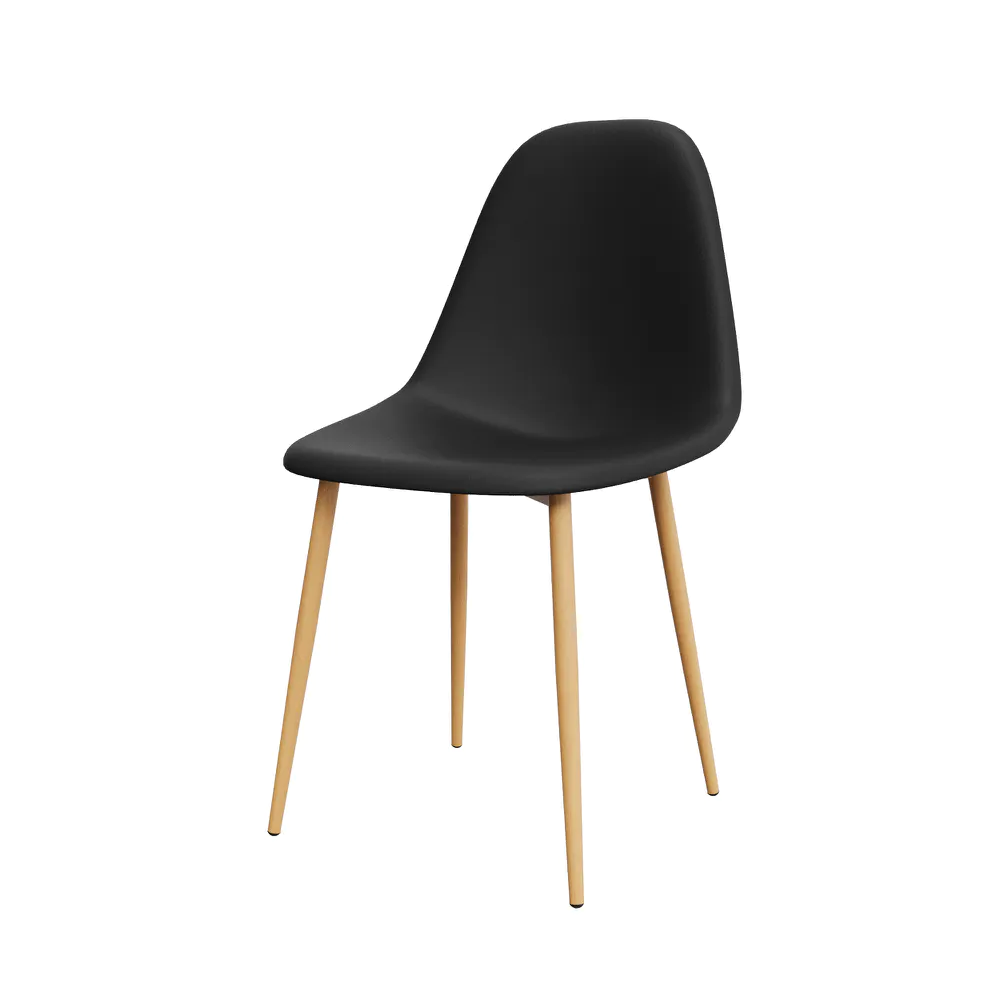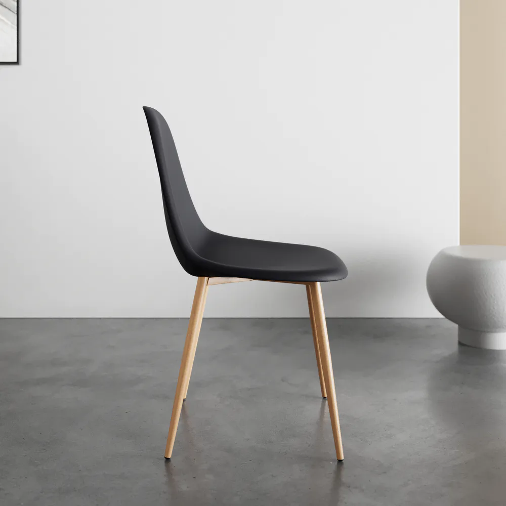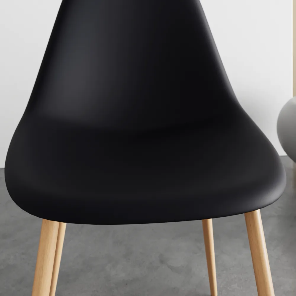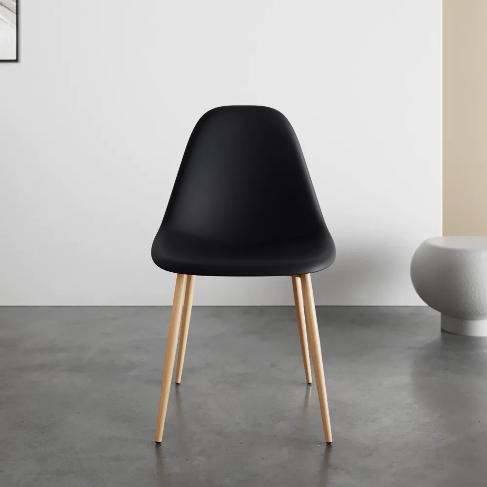 La seduta in polipropilene nera dona un aspetto sobrio ed elegante, facile da pulire e pensata per accompagnarti a lungo nel tempo. Le gambe effetto legno portano un tocco naturale e accogliente, mentre i piedini neri garantiscono stabilità e protezione al pavimento, aggiungendo un dettaglio di design moderno.