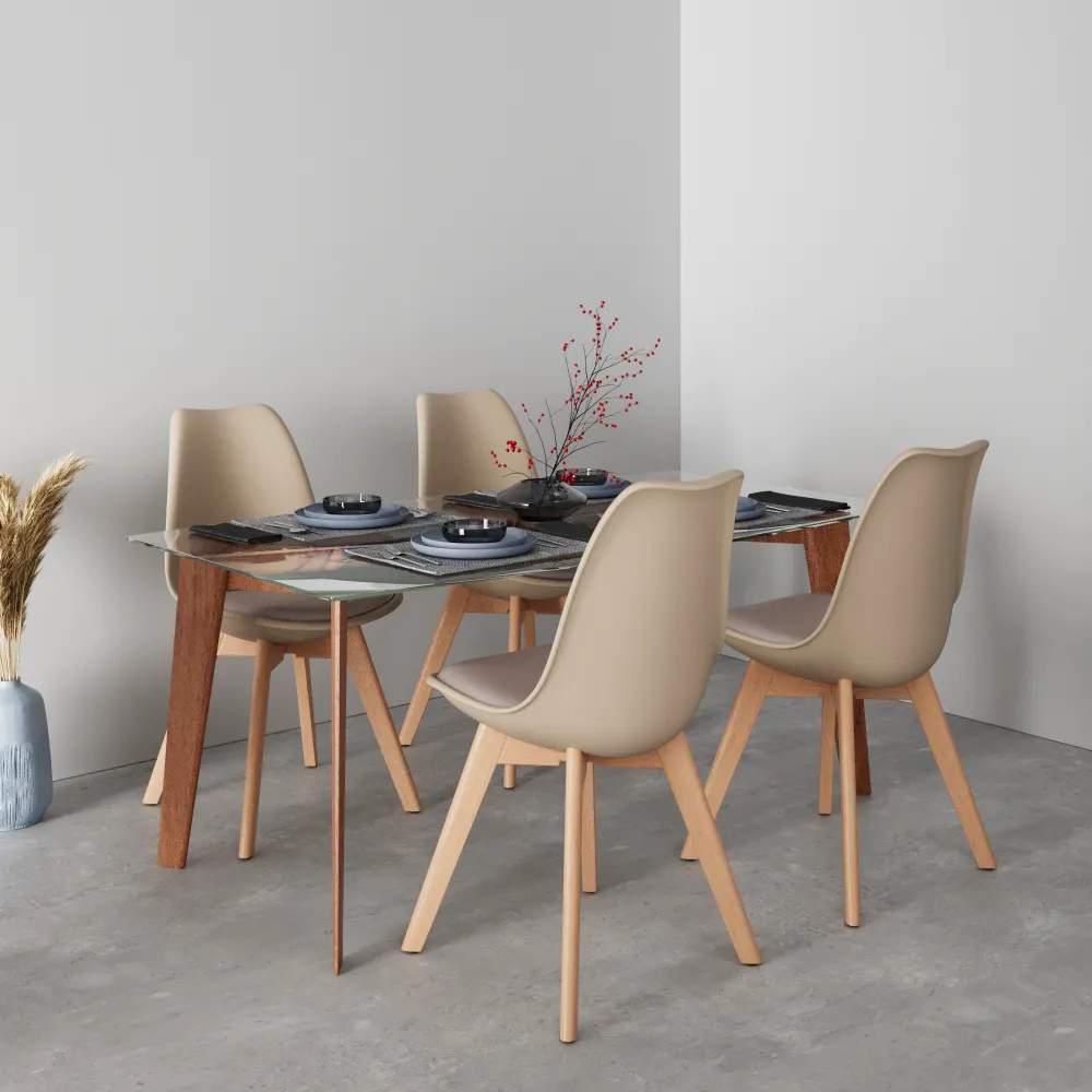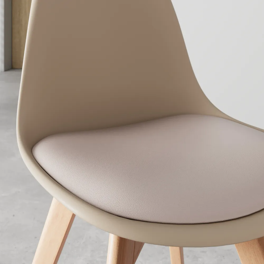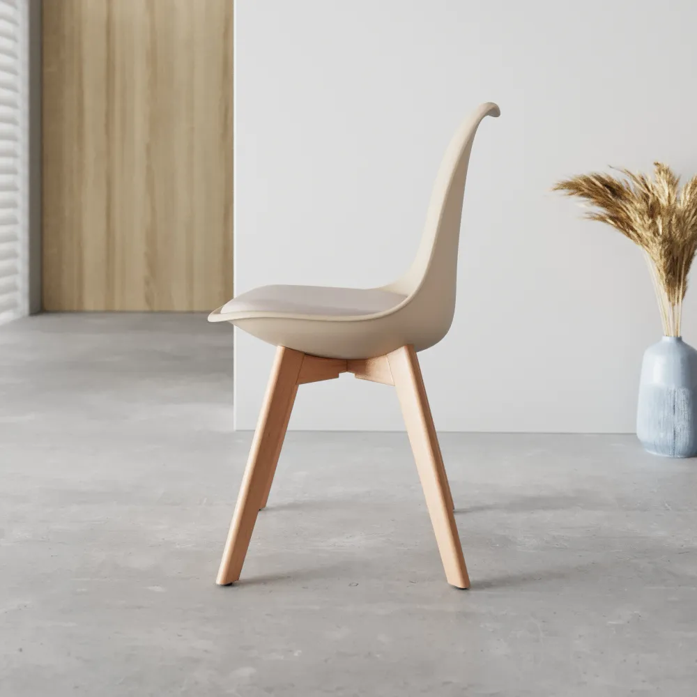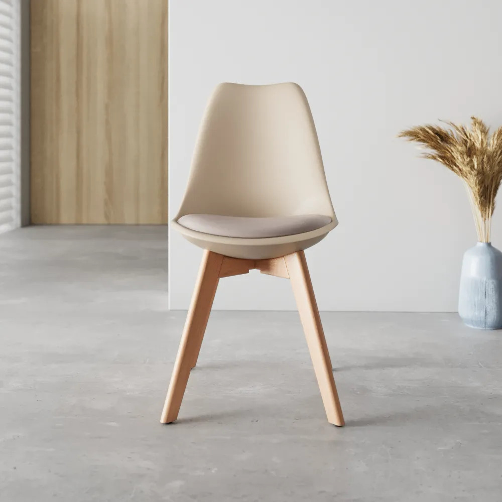 La seduta in polipropilene tortora si abbina perfettamente alle gambe in legno di faggio, creando un look sofisticato che si integra in ogni ambiente. La vera differenza sta nel cuscino della seduta, un morbido inserto in schiuma di poliuretano che garantisce un comfort eccezionale anche per le cene più lunghe.