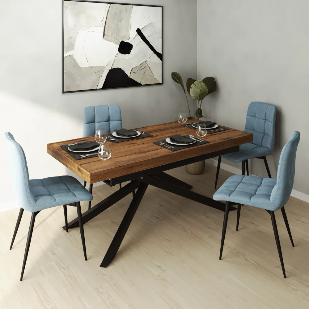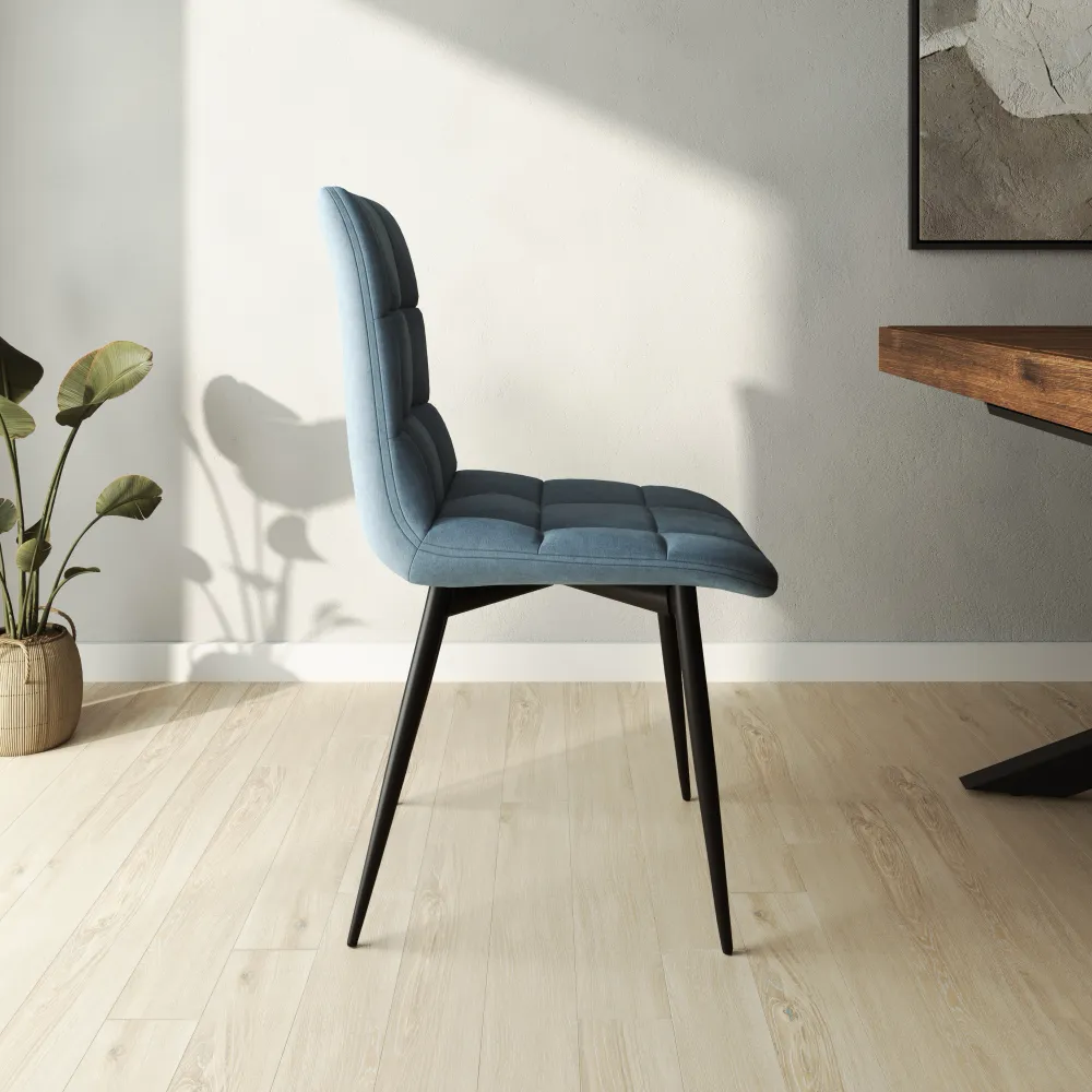 Il design è completato dalle gambe slanciate in acciaio nero opaco, che non solo offrono grande stabilità, ma aggiungono anche un tocco moderno e leggero all'insieme. Il contrasto tra il blu del velluto e il nero della struttura rende queste sedie facili da abbinare. Che tu voglia valorizzare la sala da pranzo, il soggiorno o uno studio, questo set di sedie aggiungerà carattere e raffinatezza al tuo arredamento.