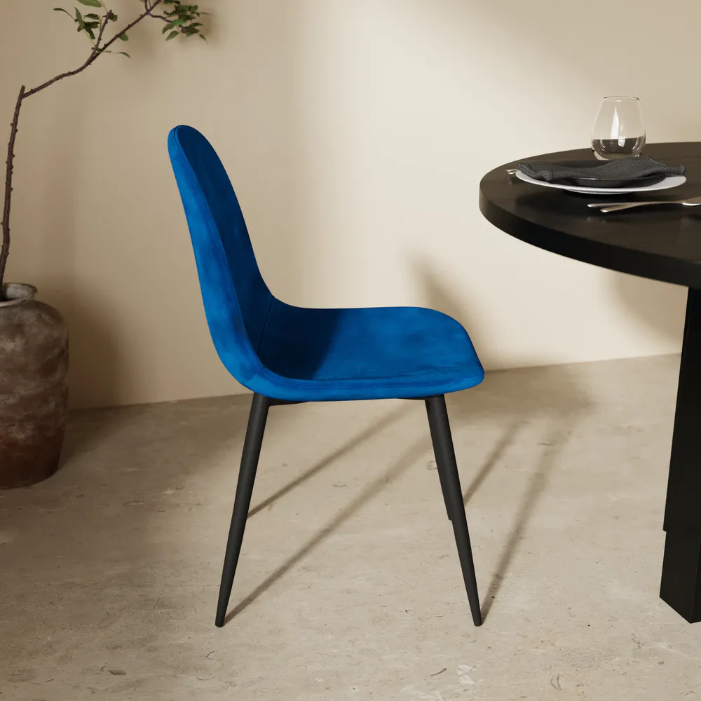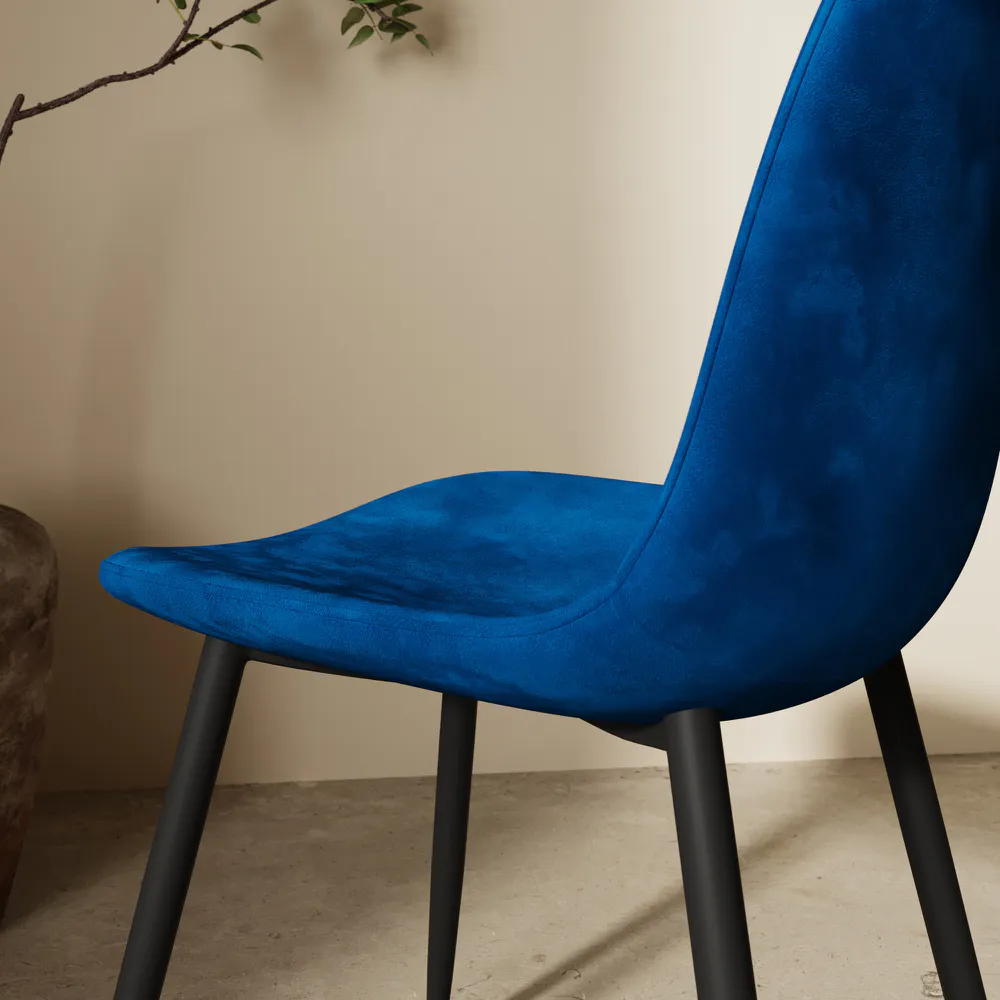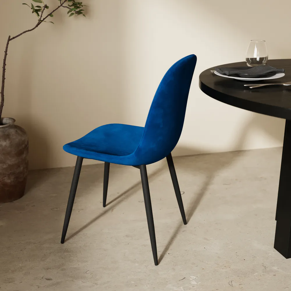 Scopri il nostro set di quattro sedie Nora, una sintesi perfetta di eleganza contemporanea e comfort avvolgente. La scocca sagomata offre un supporto ergonomico ed è rivestita in un lussuoso velluto color blu che dona immediato prestigio all'ambiente. La morbida seduta, imbottita per un comfort ottimale, poggia su una solida struttura interna in compensato che ne assicura la durabilità.