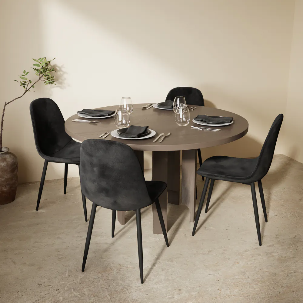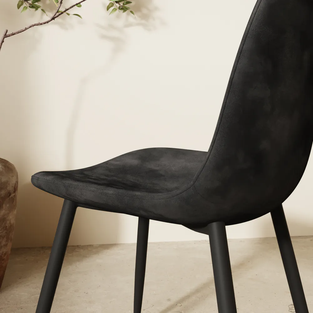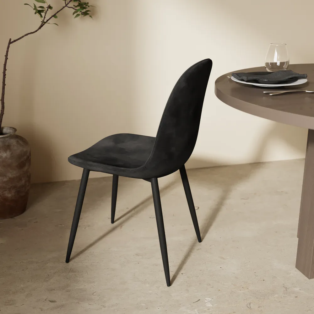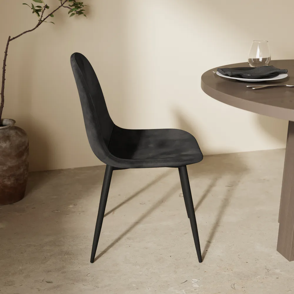 Scopri il nostro set di quattro sedie Nora, una sintesi perfetta di eleganza contemporanea e comfort avvolgente. La scocca sagomata offre un supporto ergonomico ed è rivestita in un lussuoso velluto color nero che dona immediato prestigio all'ambiente. La morbida seduta, imbottita per un comfort ottimale, poggia su una solida struttura interna in compensato che ne assicura la durabilità.