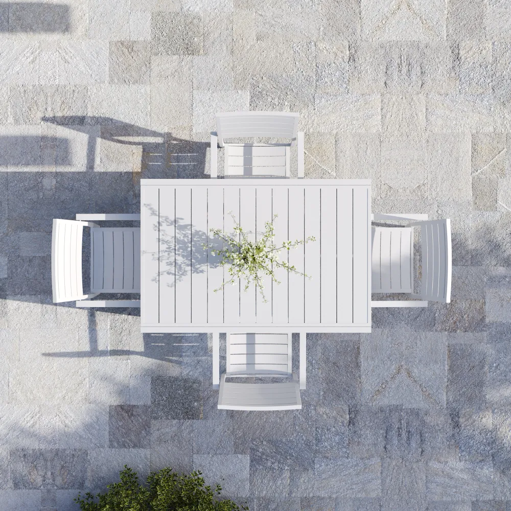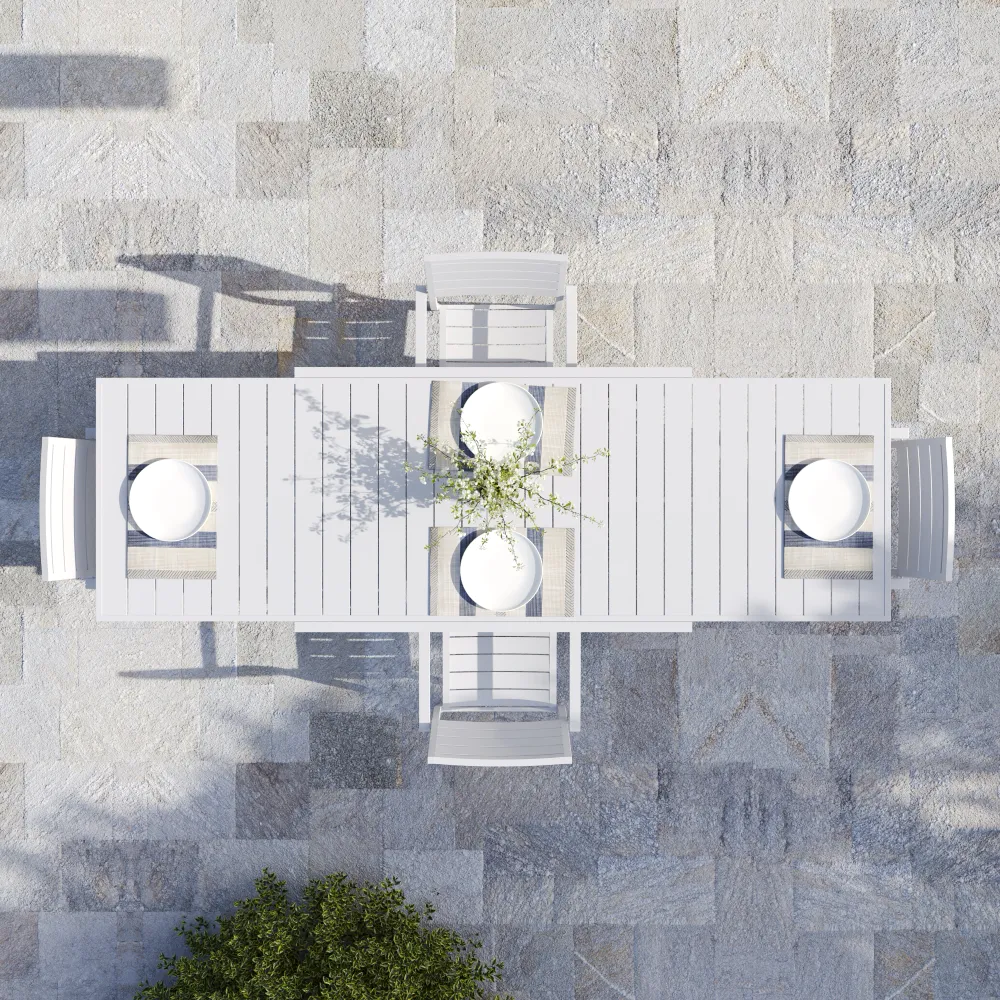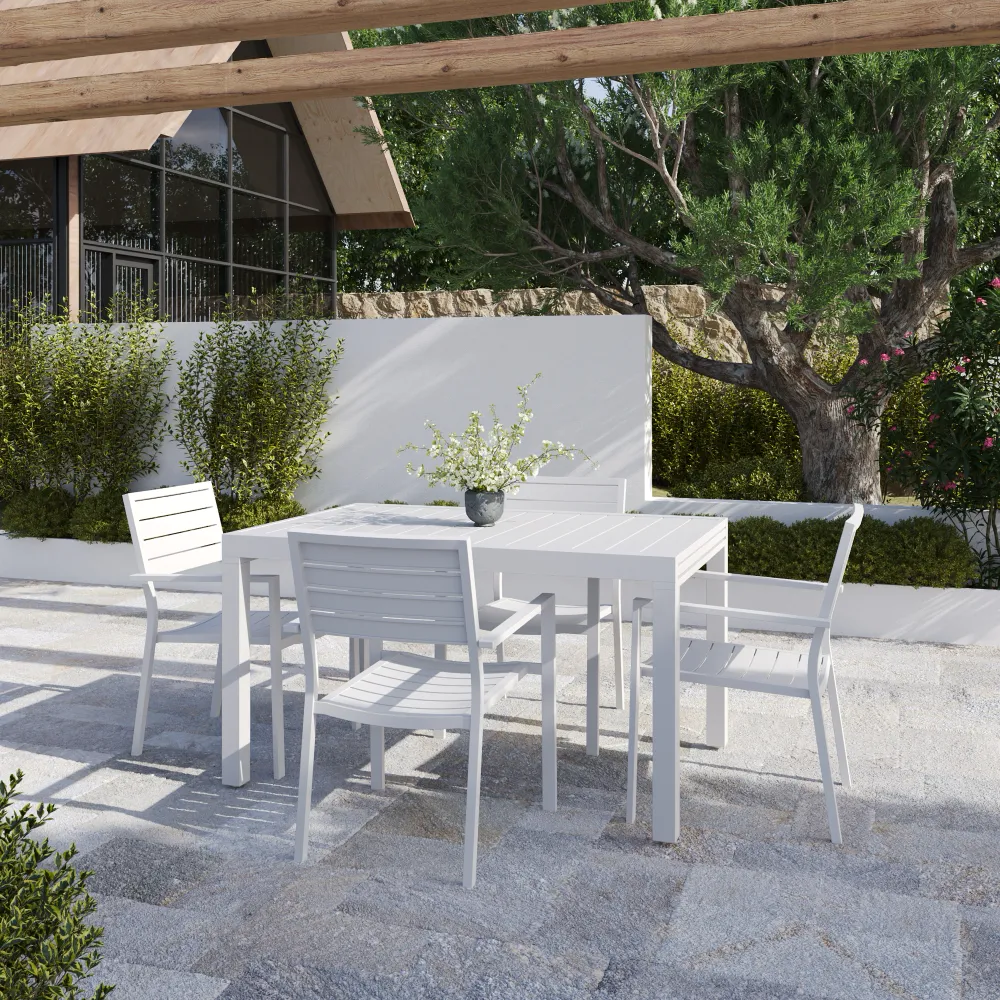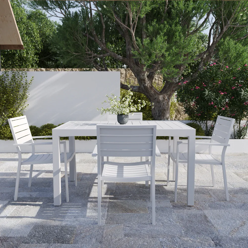 L'estetica del set è definita da una raffinata lavorazione a doghe in alluminio, presente sia sul piano del tavolo che sullo schienale delle sedute. Questo dettaglio costruttivo non solo dona un look moderno e minimale, ma è tecnicamente studiato per garantire il rapido drenaggio dell'acqua, evitando ristagni dannosi. Le sedie impilabili (61x57x88 cm) massimizzano la funzionalità: dotate di braccioli per un comfort superiore, possono essere riposte una sopra l'altra per ottimizzare lo spazio di stoccaggio quando non utilizzate.