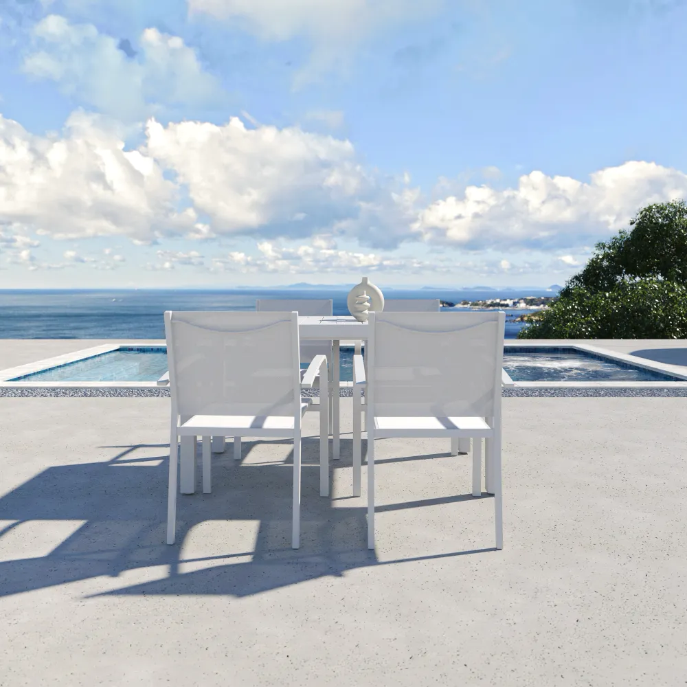A completare il set, ammorbidendo le linee dell'insieme, intervengono le sedie impilabili Marel (55,5x57x87 cm). La loro struttura si distingue per i braccioli a sezione tonda (tubolare 22 mm), un dettaglio che non solo arricchisce l'estetica ma migliora la presa e il comfort della seduta. Lo schienale e la seduta in Textilene bianco assicurano freschezza grazie alla loro elevata traspirabilità, evitando il surriscaldamento anche nelle giornate più calde e asciugandosi velocemente.