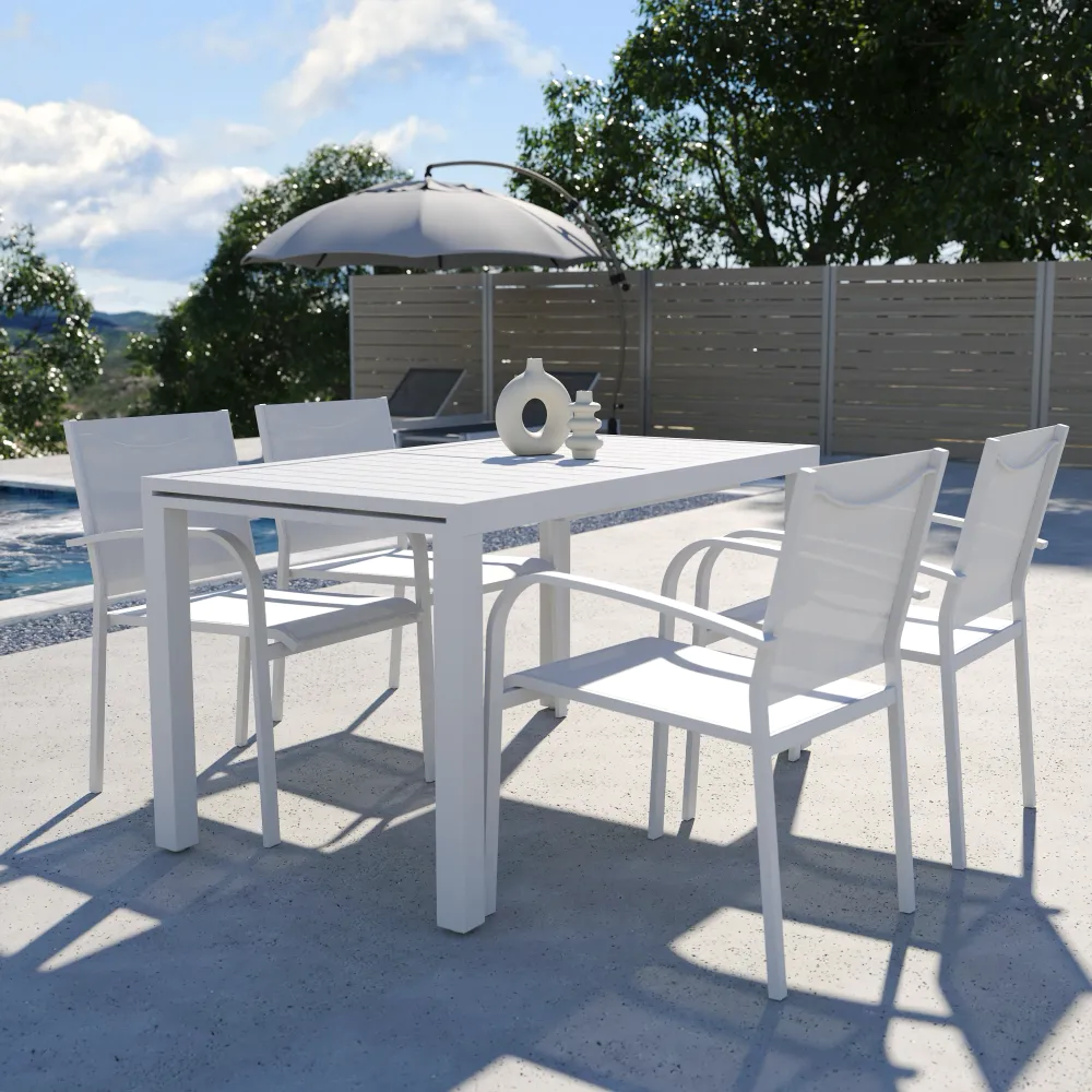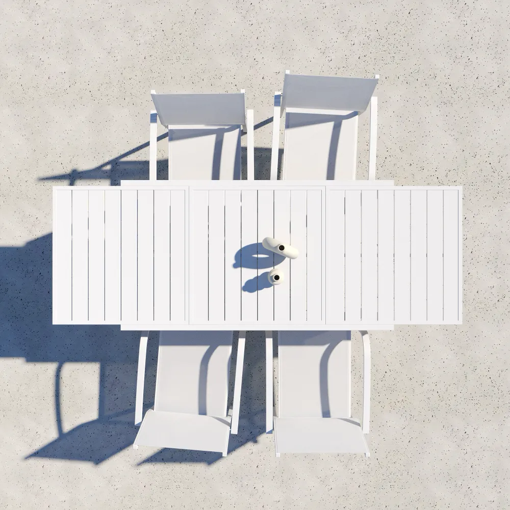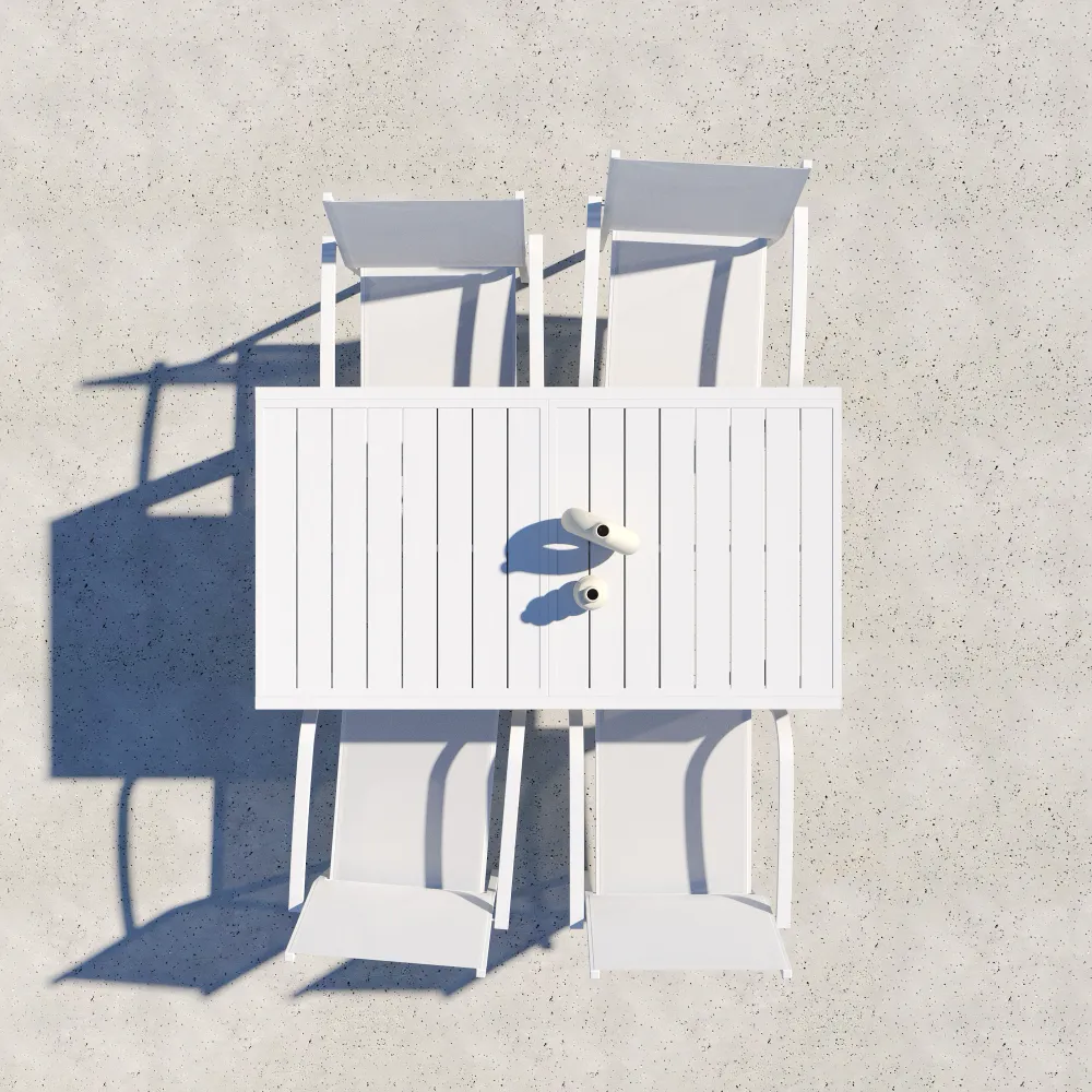 Costruito interamente in alluminio verniciato bianco e Textilene, questo set è una garanzia di durata contro ruggine, intemperie e raggi UV. Il piano del tavolo a doghe permette all'acqua di defluire, mantenendo la superficie sempre pronta all'uso. È la scelta perfetta per chi cerca un arredo funzionale, facile da gestire (le sedie sono impilabili) e capace di unire stile moderno e comodità quotidiana.