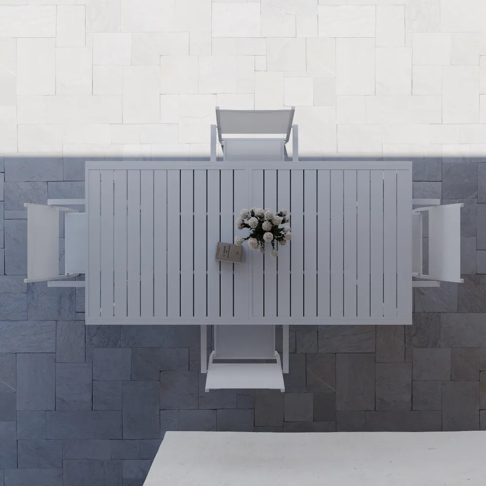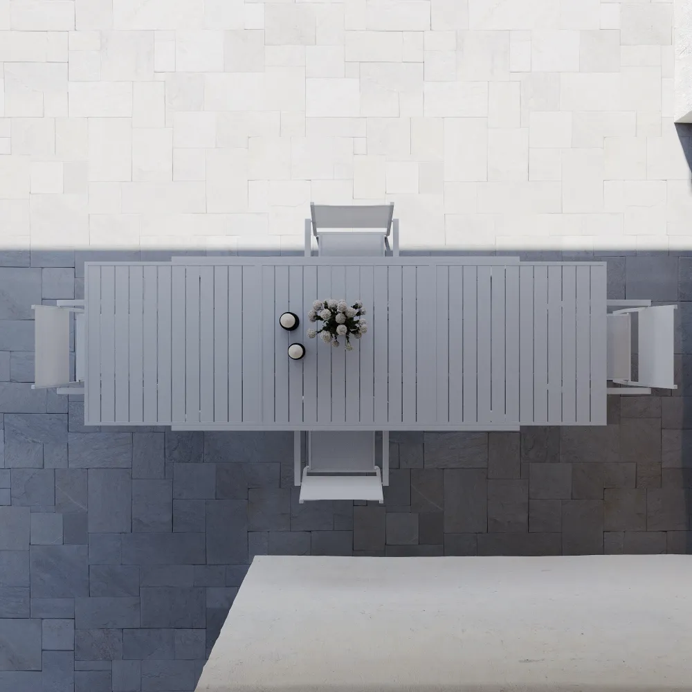Realizzato interamente in alluminio verniciato bianco, il set è progettato per durare nel tempo resistendo a ruggine, raggi UV e intemperie. Il piano a doghe del tavolo svolge una duplice funzione: estetica, alleggerendo visivamente la grande superficie, e pratica, assicurando il rapido drenaggio dell'acqua. È la scelta definitiva per chi possiede grandi spazi e desidera un arredo di prestigio a manutenzione zero.