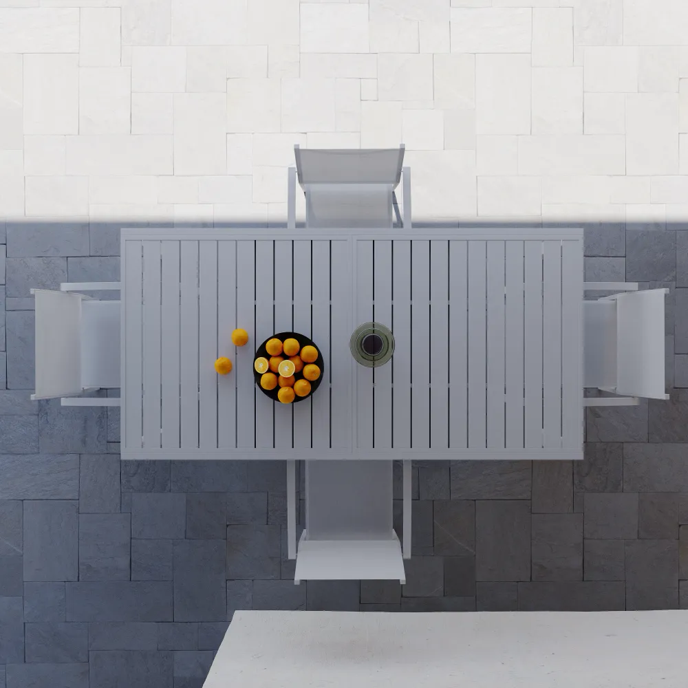 Per bilanciare le linee imponenti del tavolo, il set include le sedie impilabili Marel (55,5x57x87 cm) nella variante con braccioli a sezione tonda. Questa curvatura del tubolare in alluminio rende la presa più piacevole e addolcisce l'estetica complessiva. La seduta in Textilene bianco garantisce freschezza e comodità anche durante i lunghi pranzi estivi, grazie alla sua elevata traspirabilità e alla facilità di pulizia.
