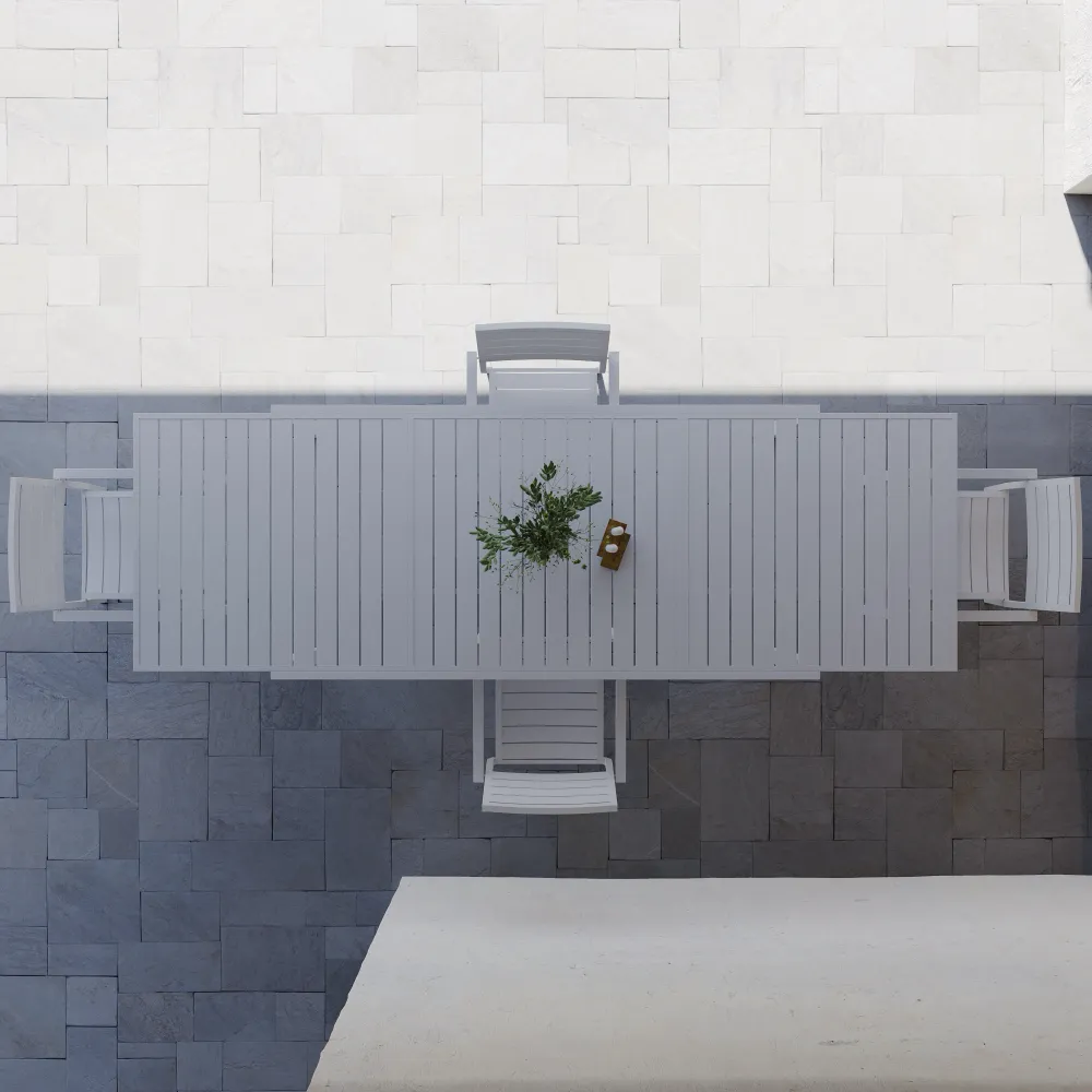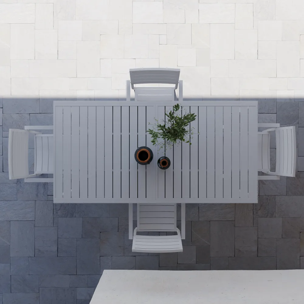 L'intero set è realizzato in alluminio verniciato bianco, garanzia di una resistenza totale contro la ruggine, l'umidità e i raggi UV. La continuità estetica tra tavolo e sedie è data dal raffinato design a doghe, che conferisce un look contemporaneo e svolge la fondamentale funzione tecnica di far defluire rapidamente l'acqua piovana.