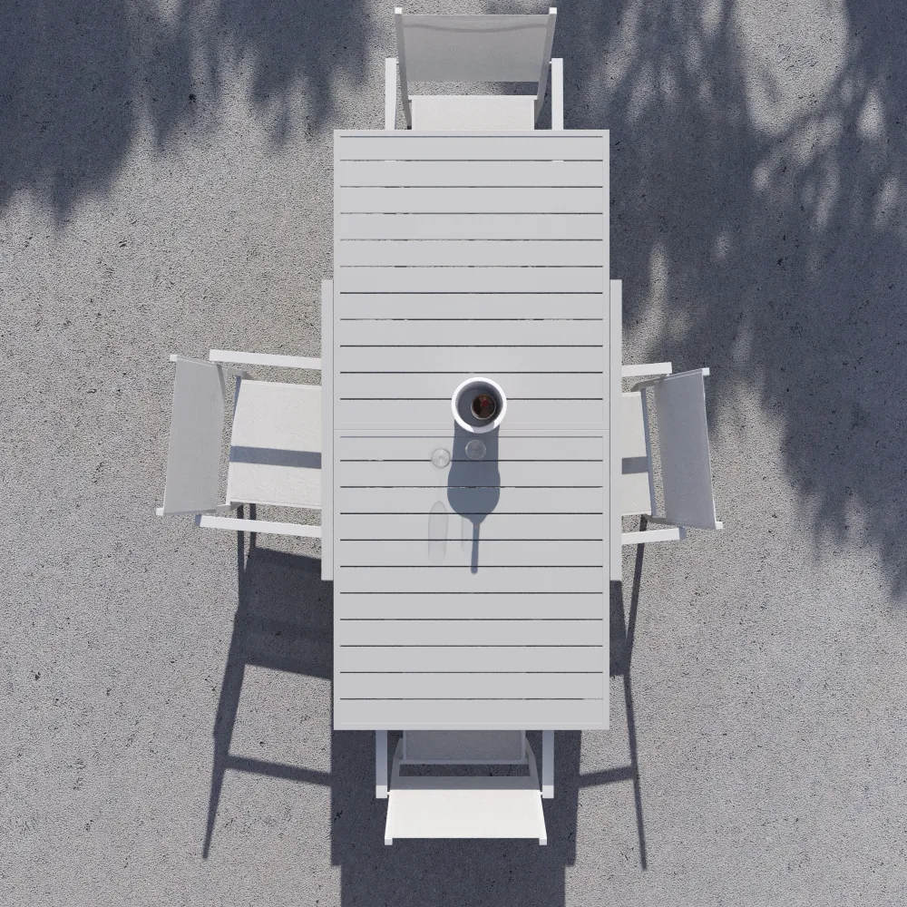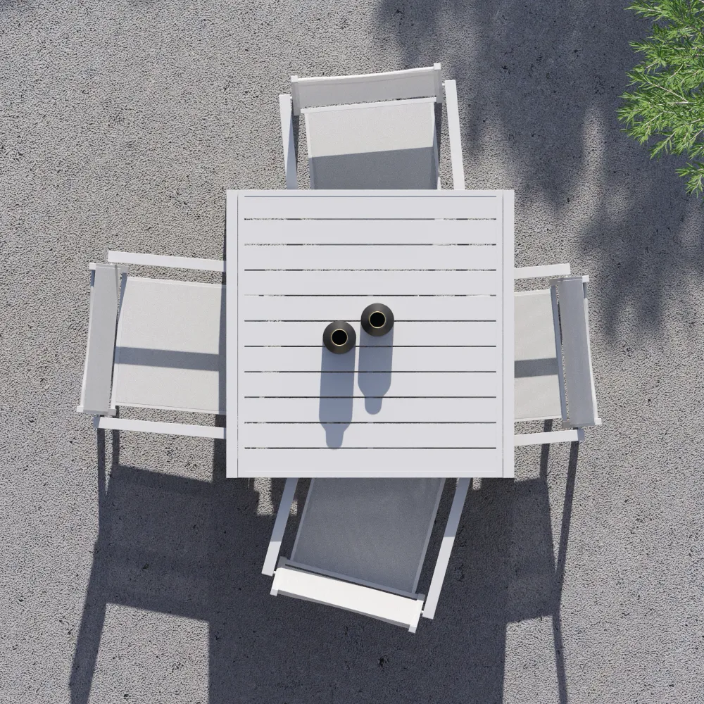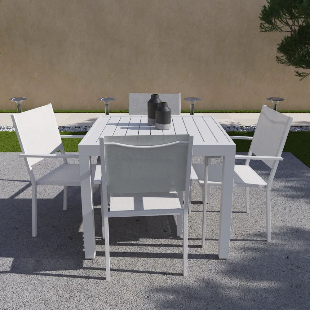 La coerenza geometrica del set è garantita dalle sedie impilabili Marel (55,5x57x87 cm), caratterizzate da una struttura in alluminio con profilo squadrato (22x22 mm). Le linee nette dei braccioli incorniciano la seduta in Textilene, creando un effetto visivo pulito e sofisticato. Oltre all'estetica, le sedie offrono massime prestazioni: il tessuto tecnico garantisce una traspirabilità eccezionale e si asciuga rapidamente, risultando perfetto per l'uso intensivo all'aperto.