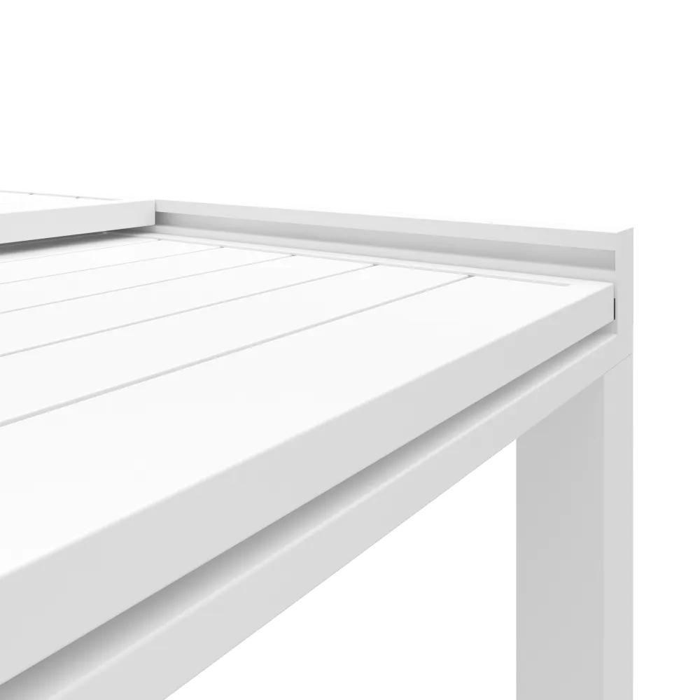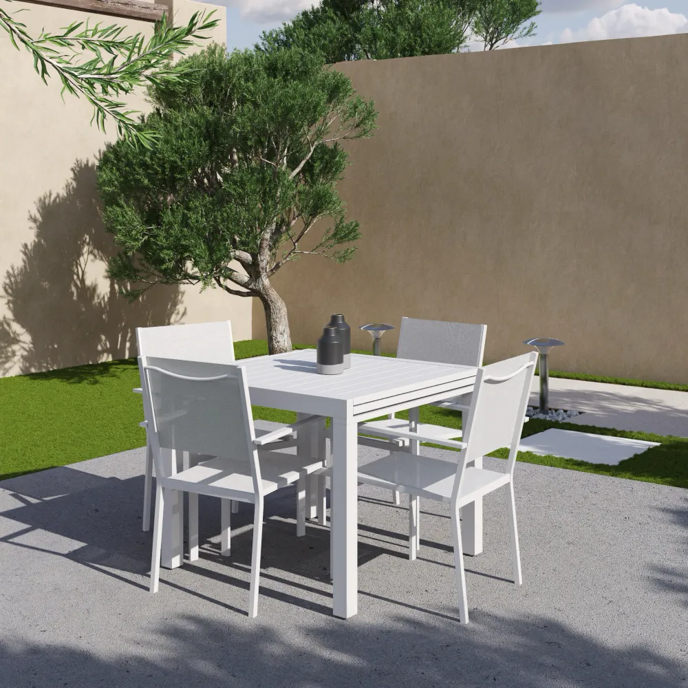 Set da esterno bianco con tavolo allungabile 90/180x74cm e 4 sedie in alluminio con textilene e braccioli squadrati | Marel