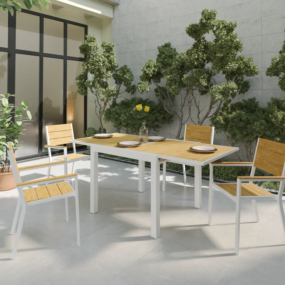 Porta nel tuo giardino il fascino intramontabile del legno unito alla tecnologia dei materiali moderni con questo esclusivo set da pranzo outdoor. La composizione è studiata per chi ama l'estetica naturale ma non vuole rinunciare alla praticità: il calore visivo del Polywood incontra la solidità dell'alluminio verniciato bianco, creando un arredo dal gusto contemporaneo, perfetto per verande, terrazzi e dehor che richiedono un tocco di eleganza materica.
