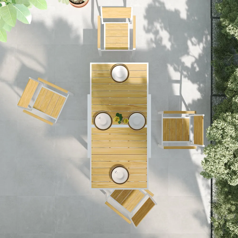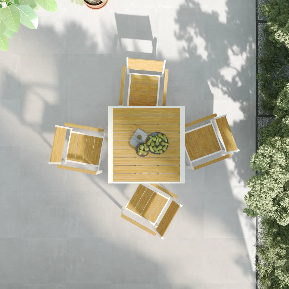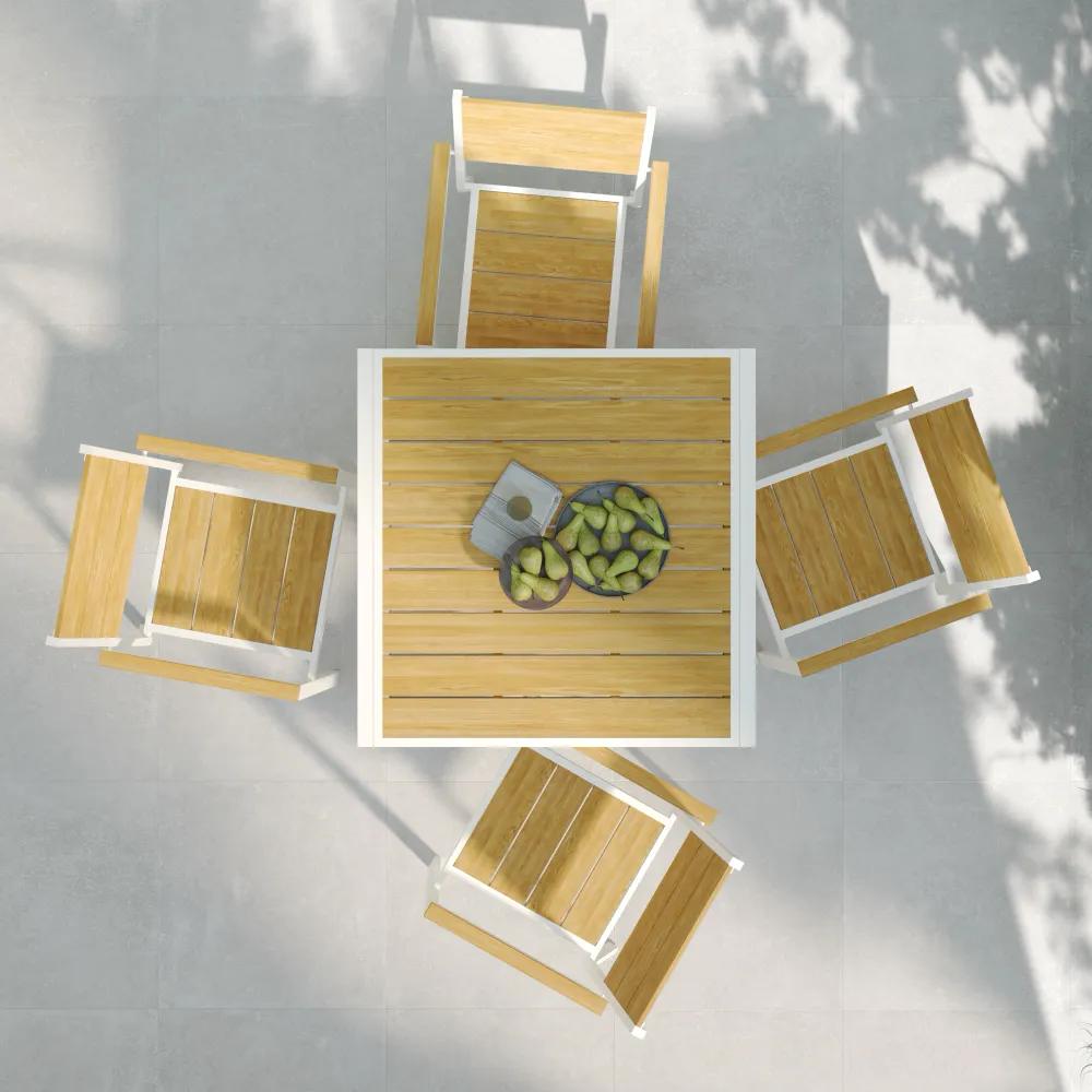 Il protagonista della scena è il tavolo quadrato allungabile. In configurazione chiusa si presenta come un compatto piano da 90x90 cm, ideale per la colazione o un pranzo intimo. Quando l'occasione lo richiede, il fluido sistema di apertura a scorrimento permette di raddoppiare la superficie fino a 180 cm, offrendo spazio comodo per ospitare fino a 8 persone. Il piano in Polywood effetto legno restituisce alla vista e al tatto le venature naturali, ma con un vantaggio fondamentale: è completamente idrorepellente e non richiede oli o trattamenti stagionali.