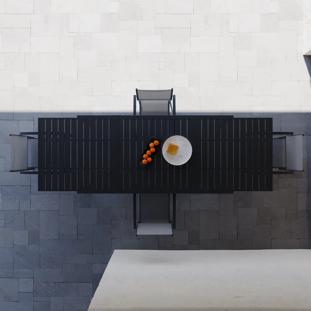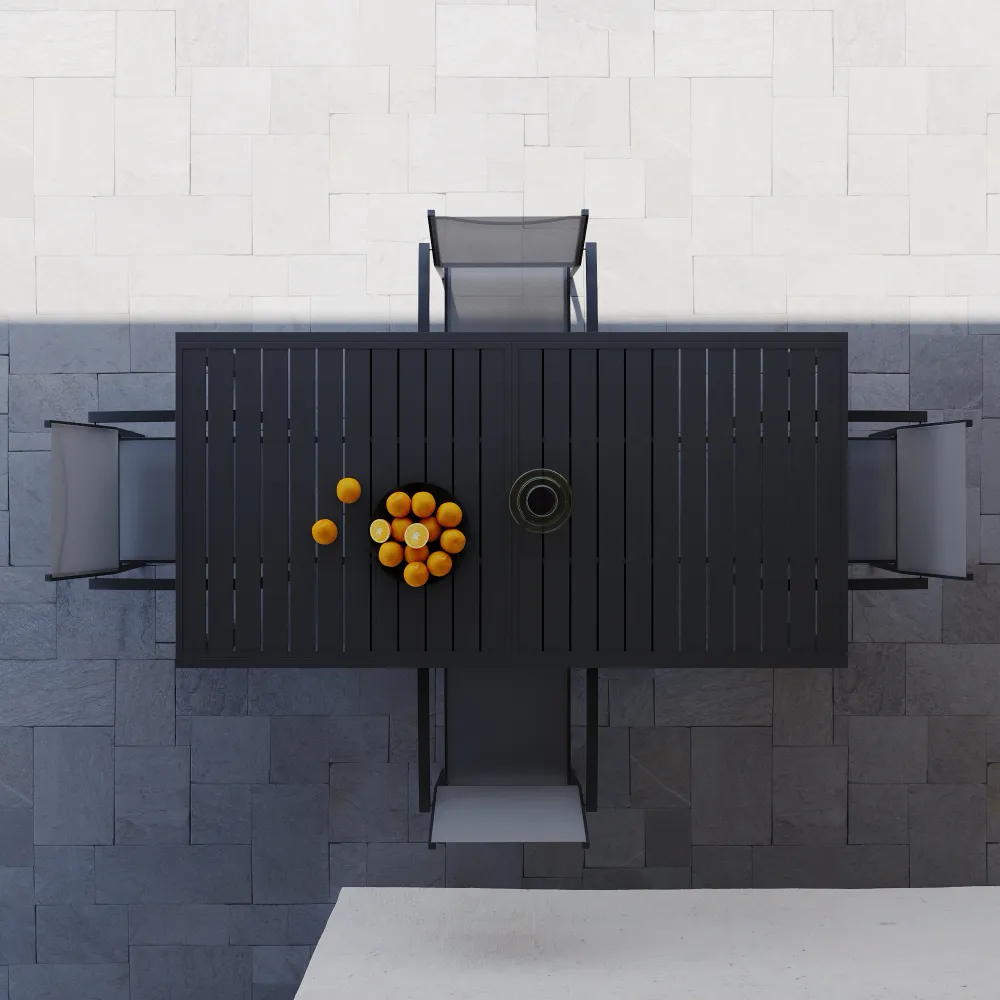 Costruito per resistere all'aperto, il set combina la robustezza dell'alluminio verniciato alla praticità del tessuto tecnico, eliminando il problema della ruggine e della manutenzione. Il design a doghe del piano assicura che l'acqua piovana defluisca rapidamente, lasciando le superfici sempre asciutte. Un set prestigioso e funzionale, ideale per chi vive l'esterno in compagnia numerosa.