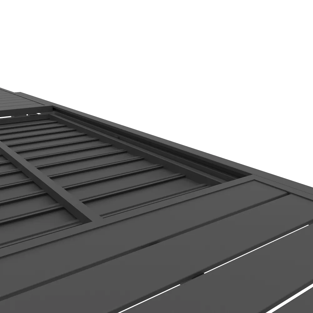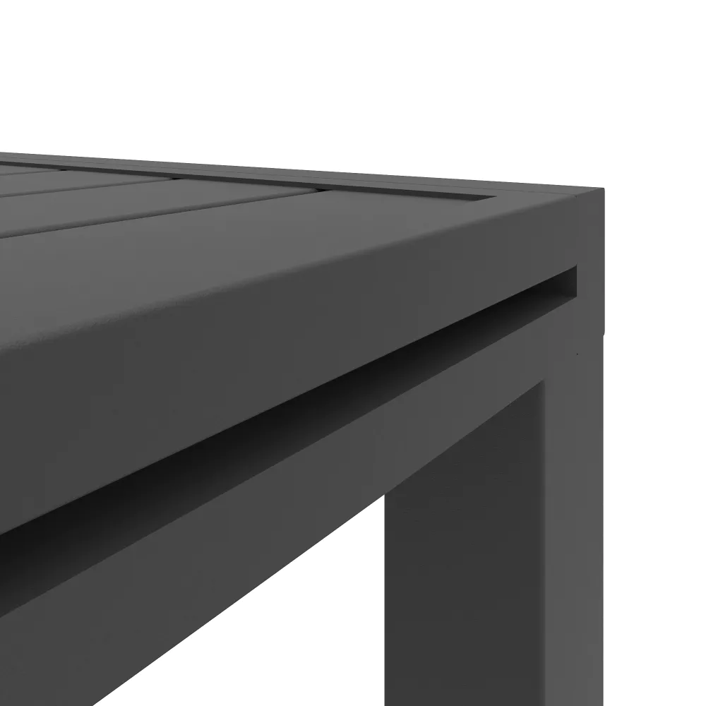 L'intero set è realizzato in alluminio verniciato grigio, garanzia di una resistenza totale contro la ruggine, l'umidità e i raggi UV. La continuità estetica tra tavolo e sedie è data dal raffinato design a doghe, che conferisce un look contemporaneo e svolge la fondamentale funzione tecnica di far defluire rapidamente l'acqua piovana.