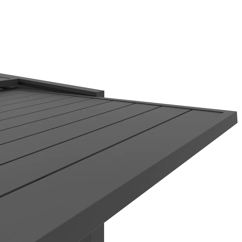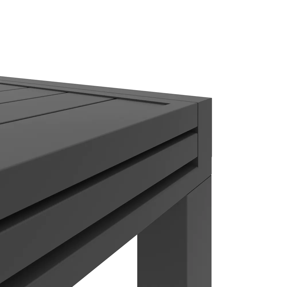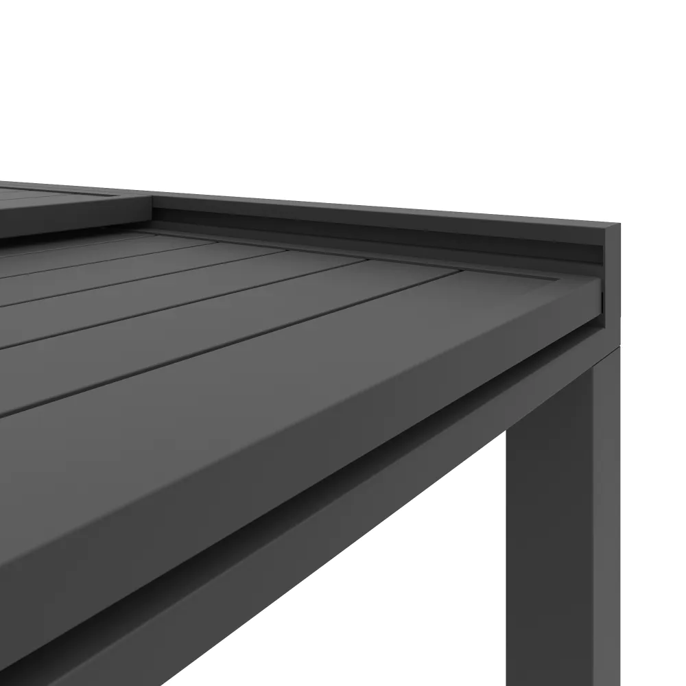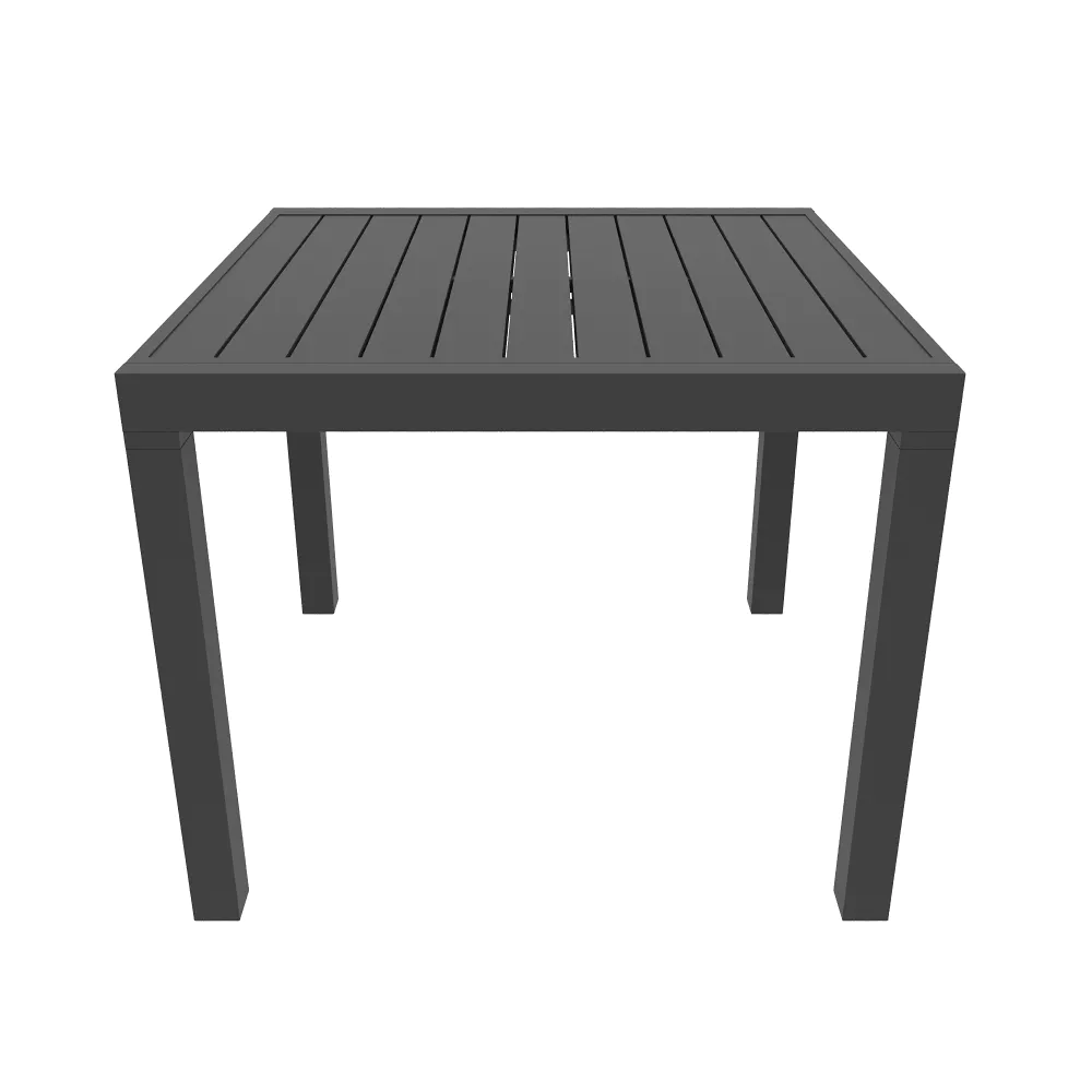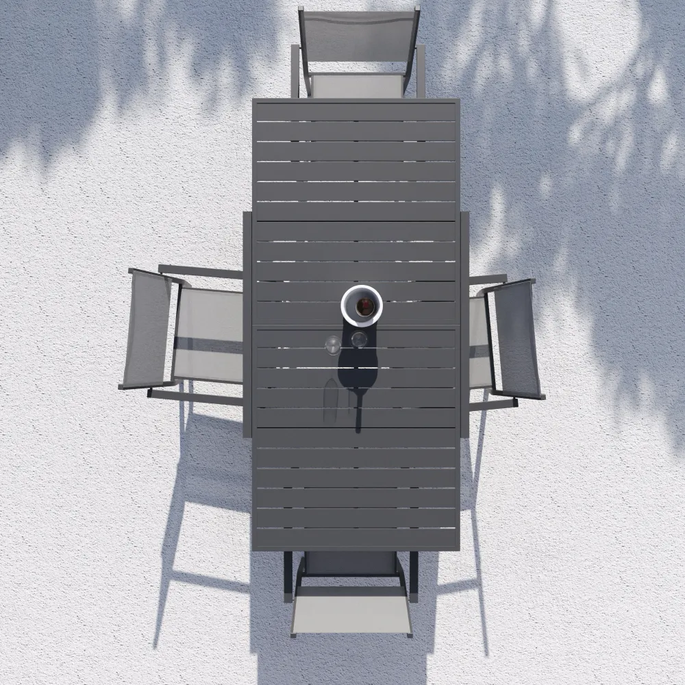Realizzato interamente in alluminio verniciato a polvere, questo set resiste perfettamente a ruggine, raggi UV e intemperie, mantenendo inalterata la profondità del colore nel tempo. Il piano a doghe favorisce il drenaggio dell'acqua piovana, assicurando che il tavolo sia sempre pronto all'uso. Una scelta di carattere che unisce la praticità del formato salvaspazio alla robustezza dei materiali tecnici.