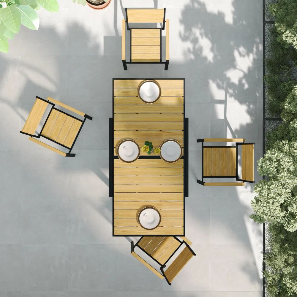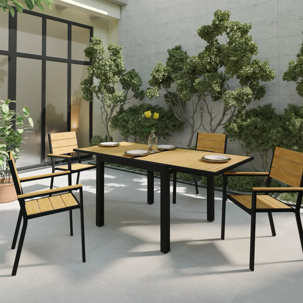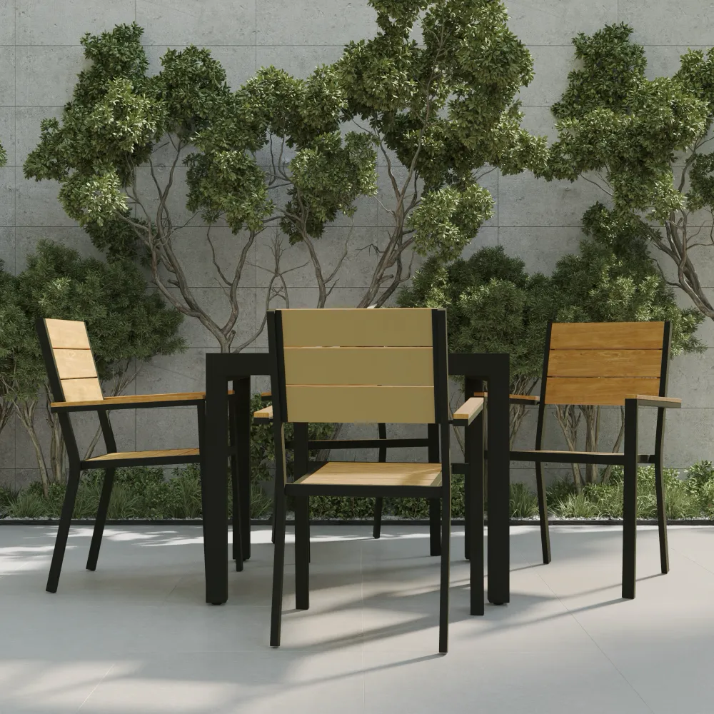 Porta nel tuo giardino il fascino intramontabile del legno unito alla tecnologia dei materiali moderni con questo esclusivo set da pranzo outdoor. La composizione è studiata per chi ama l'estetica naturale ma non vuole rinunciare alla praticità: il calore visivo del Polywood incontra la solidità dell'alluminio verniciato nero, creando un arredo dal gusto contemporaneo, perfetto per verande, terrazzi e dehor che richiedono un tocco di eleganza materica.