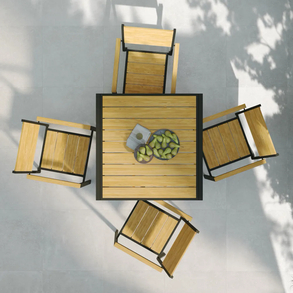 Il protagonista della scena è il tavolo quadrato allungabile. In configurazione chiusa si presenta come un compatto piano da 90x90 cm, ideale per la colazione o un pranzo intimo. Quando l'occasione lo richiede, il fluido sistema di apertura a scorrimento permette di raddoppiare la superficie fino a 180 cm, offrendo spazio comodo per ospitare fino a 8 persone. Il piano in Polywood effetto legno restituisce alla vista e al tatto le venature naturali, ma con un vantaggio fondamentale: è completamente idrorepellente e non richiede oli o trattamenti stagionali.