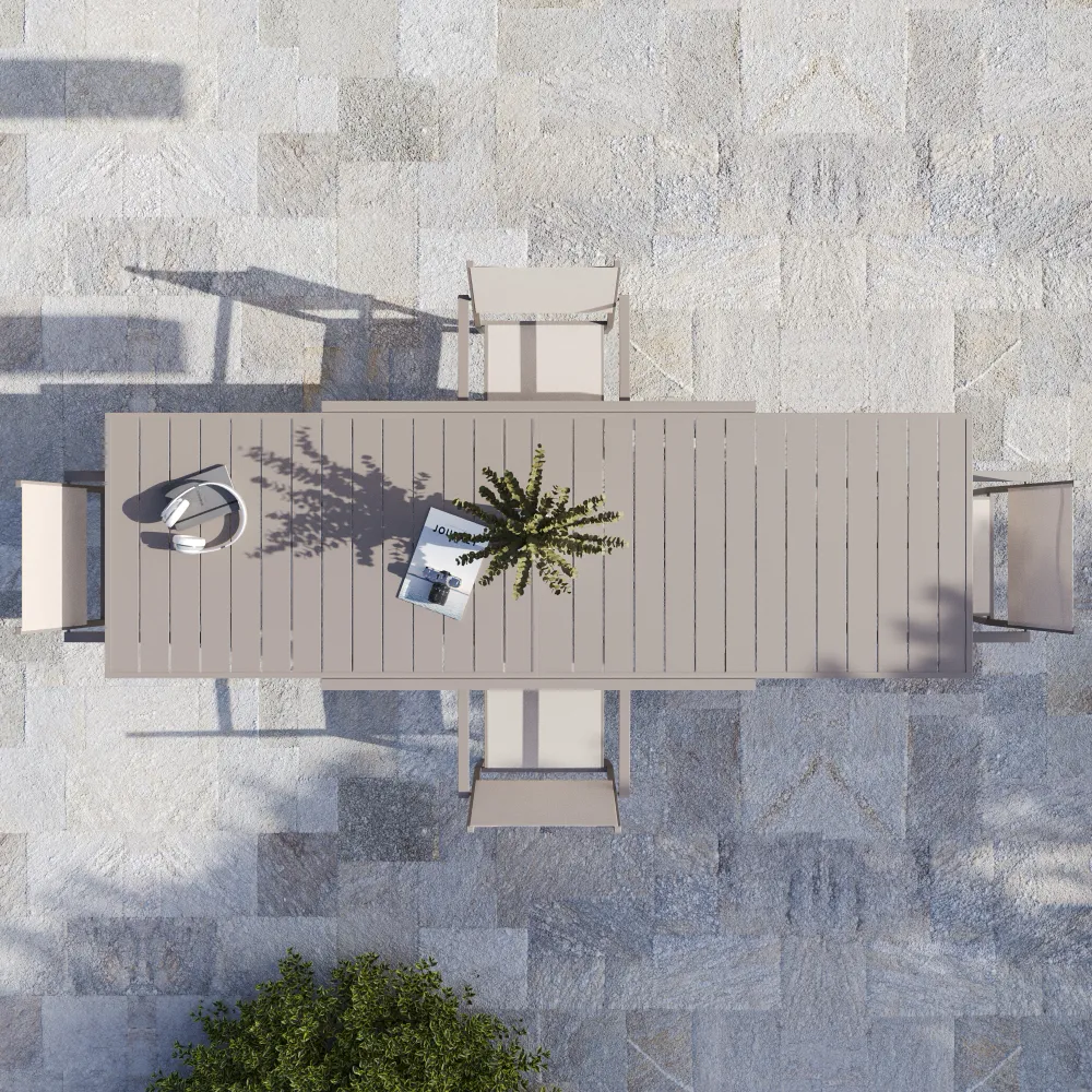 L'intero set è progettato per resistere all'aperto: la struttura in alluminio verniciato è immune alla ruggine, mentre il Textilene non teme raggi UV, cloro o salsedine. Il piano del tavolo a doghe favorisce il drenaggio dell'acqua, rendendo la manutenzione quasi inesistente.