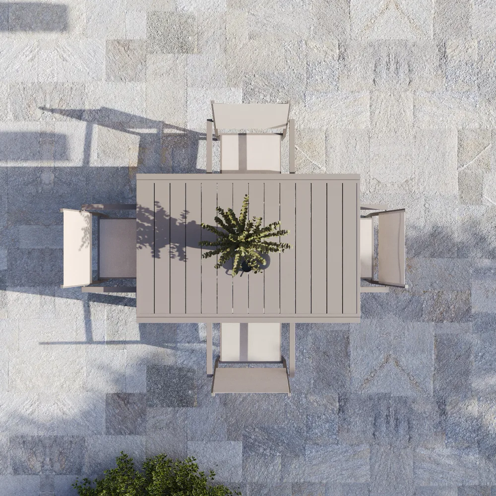 Il design rigoroso del tavolo trova il suo naturale completamento nelle sedie impilabili Marel (55,5x57x87 cm). Queste sedute riprendono il linguaggio formale del tavolo attraverso una struttura in alluminio a profilo squadrato (22x22 mm) e braccioli dalle linee nette, creando un effetto visivo di grande pulizia minimalista. La seduta e lo schienale sono realizzati in Textilene tortora, un tessuto tecnico che garantisce un comfort superiore e una traspirabilità eccezionale, evitando il surriscaldamento e asciugandosi rapidamente dopo la pioggia.