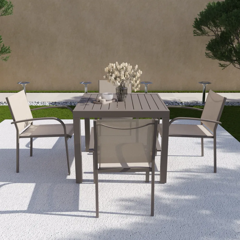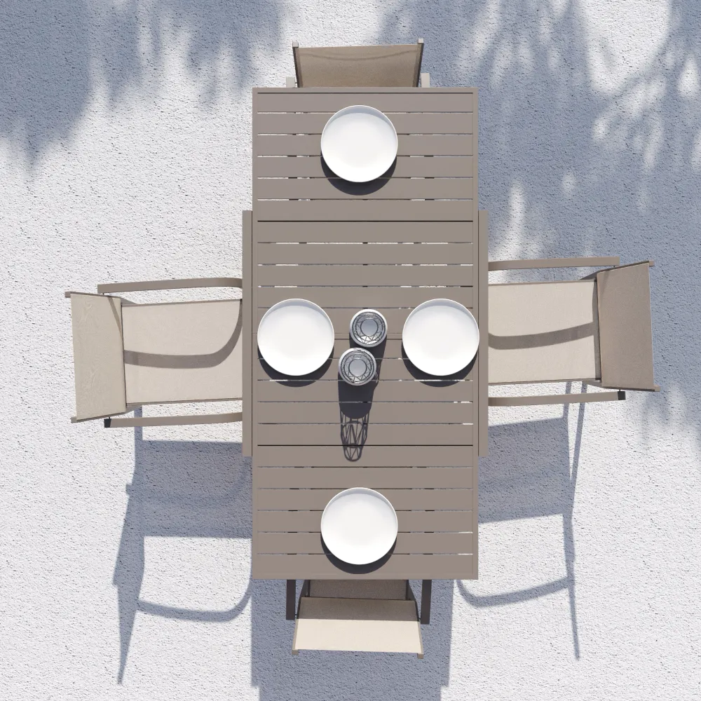 Set da esterno tortora con tavolo allungabile 90/180x74cm e 4 sedie in alluminio con textilene e braccioli tondi | Marel