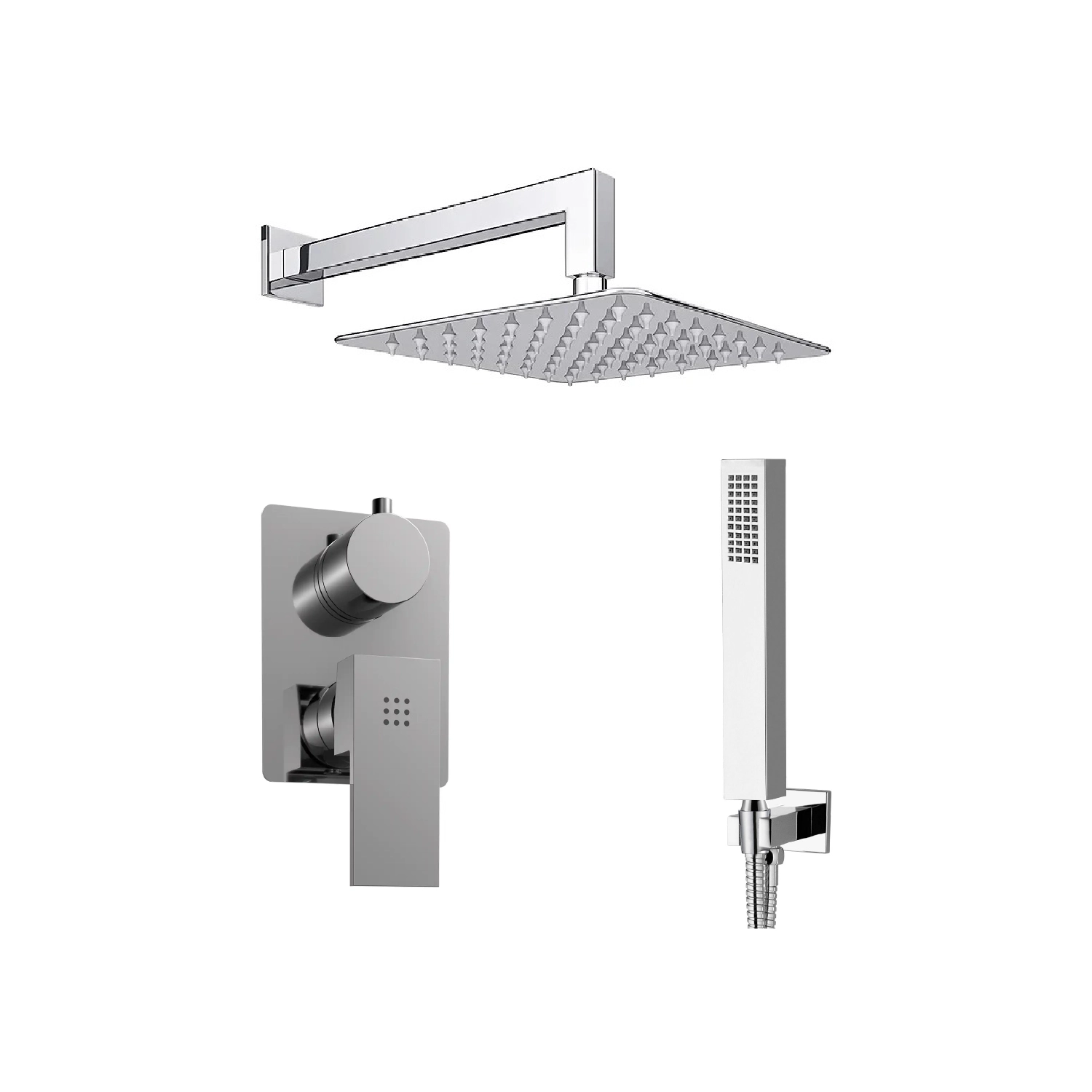 Set doccia completo con forma squadrata colore cromo: Miscelatore incasso con deviatore a 2 vie, braccio da 30cm, soffione ultraslim 20x20cm e kit doccia con flessibile