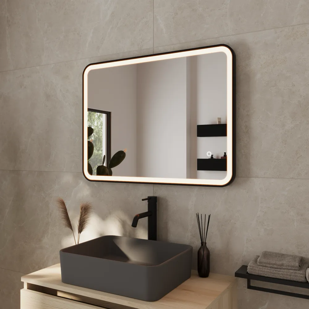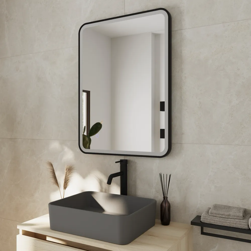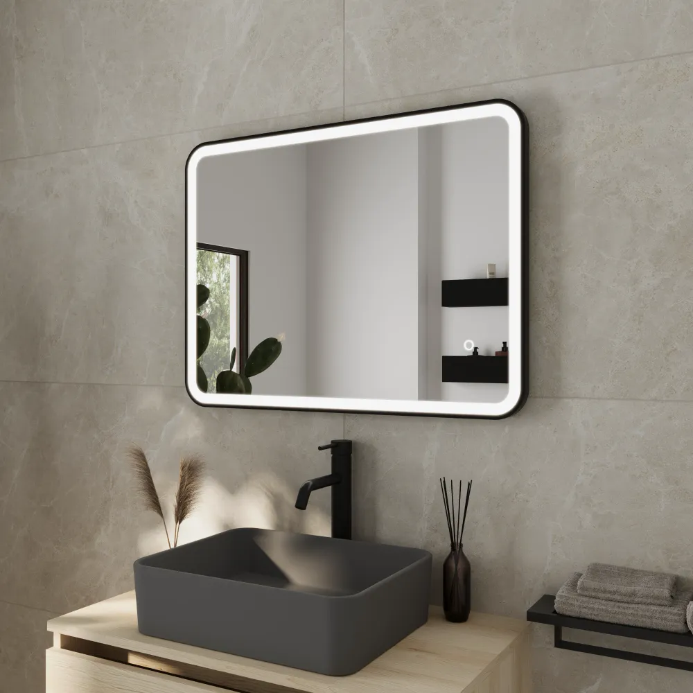 Specchio led 50x70cm con cornice nero opaco reversibile luce calda, neutra, fredda e funzione anti-appannamento | Nunki