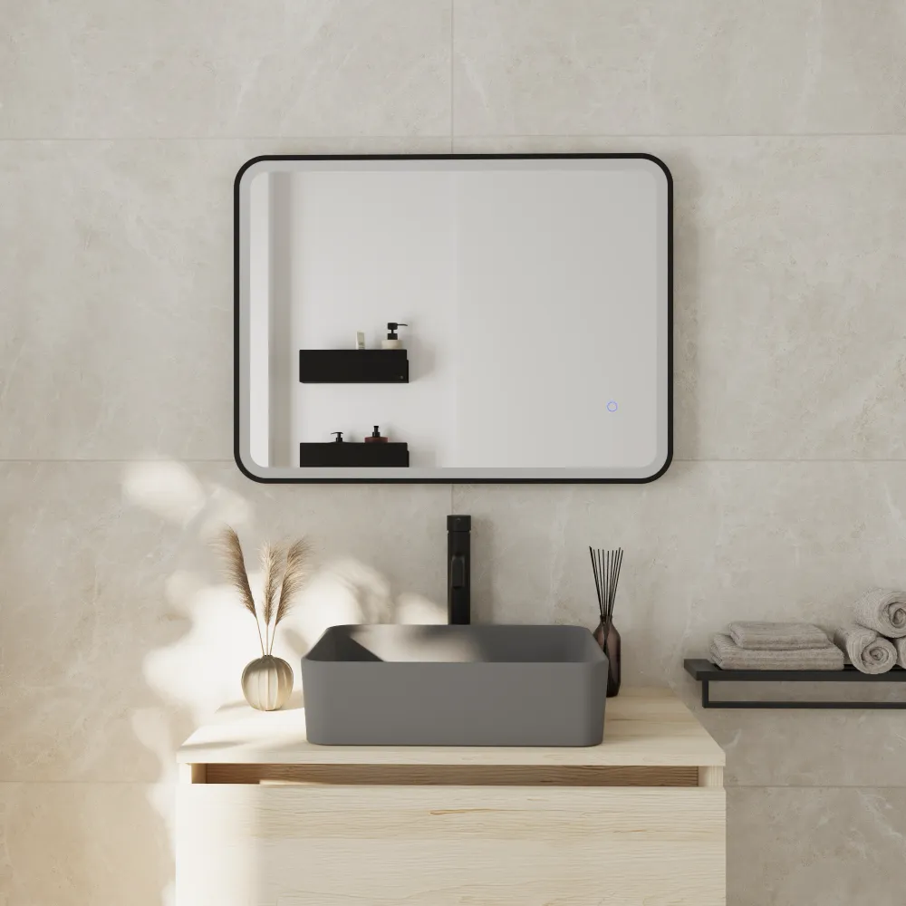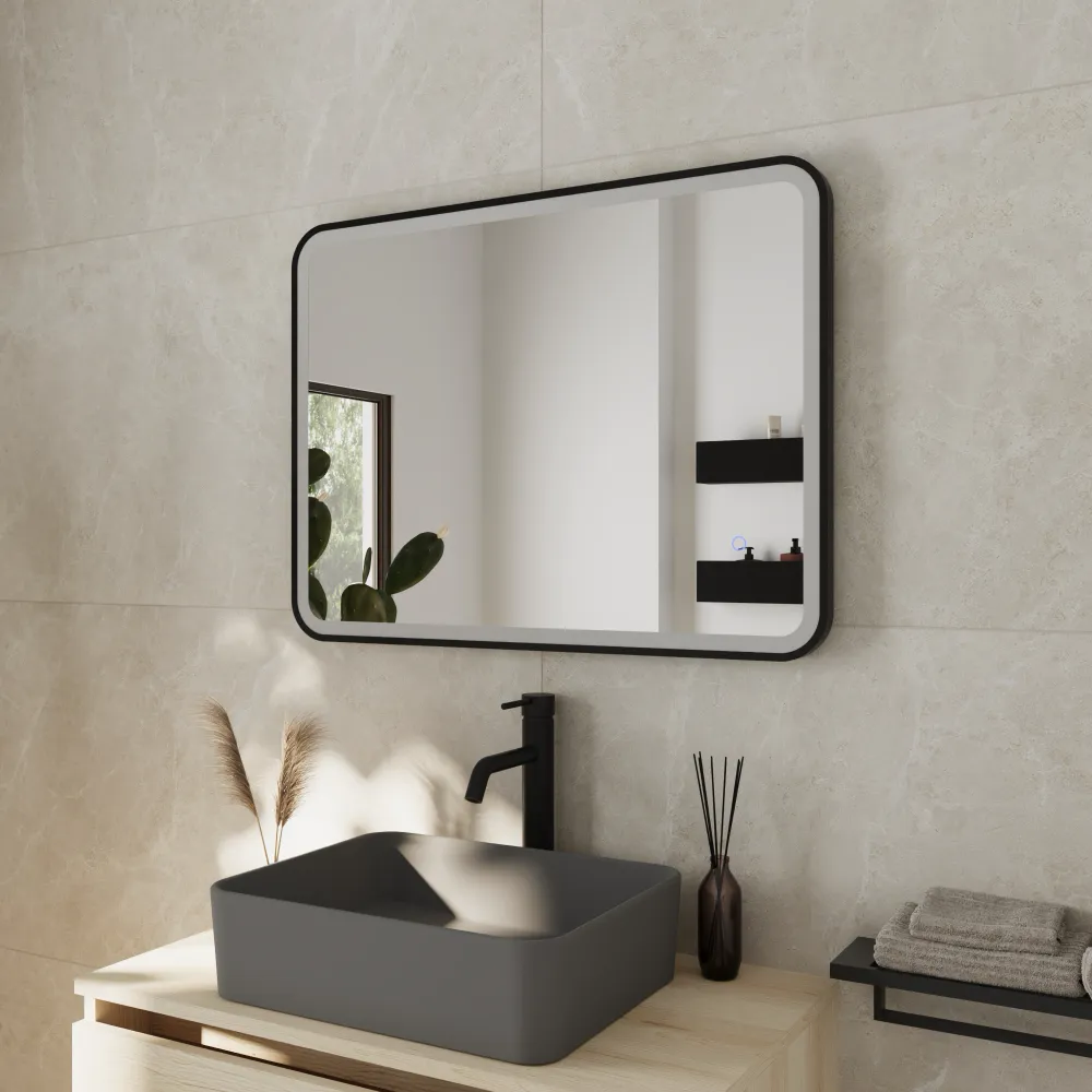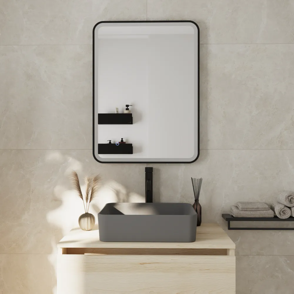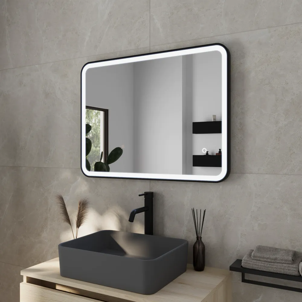 Specchio led 50x70cm con cornice nero opaco reversibile luce calda, neutra, fredda e funzione anti-appannamento | Nunki