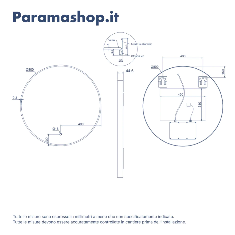 Il modello Baten è uno specchio rotondo dal diametro di 80 cm che coniuga perfettamente estetica e funzionalità. Caratterizzato da una raffinata cornice in alluminio che ne delinea il perimetro con eleganza, questo specchio rappresenta la scelta ideale per chi desidera aggiungere un tocco di modernità e classe al proprio bagno. La superficie riflettente è realizzata in vetro da 4mm, supportata da una pellicola di sicurezza posteriore che ne garantisce resistenza e protezione nel tempo.