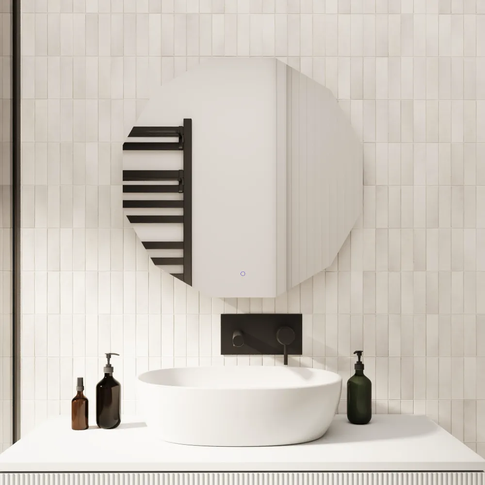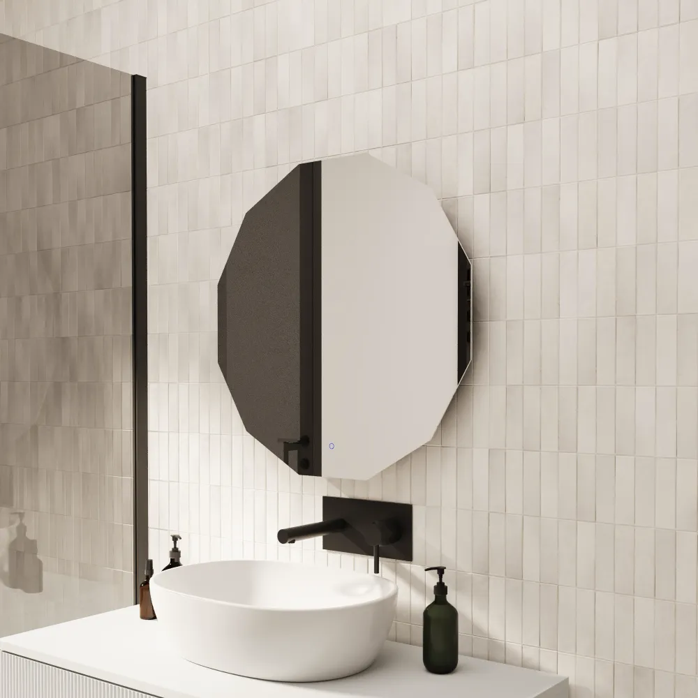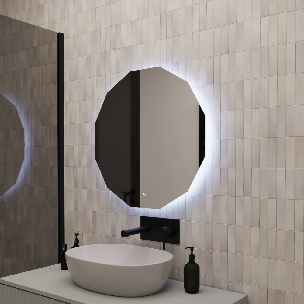 Lo specchio Algol da 100 cm unisce eleganza moderna e funzionalità avanzata, ideale per ambienti sofisticati come bagni, camere da letto e zone vanity. La sua forma geometrica contemporanea, valorizzata dalla retroilluminazione LED uniforme, crea un effetto luminoso raffinato che dona profondità e stile a qualsiasi spazio.