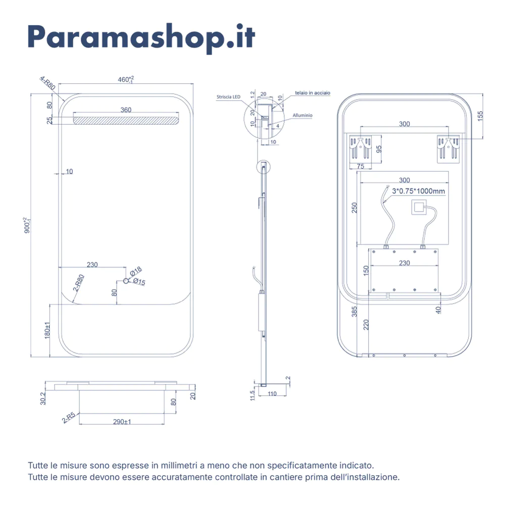 Con le sue dimensioni di 46x90 cm, questo specchio si distingue per la pregevole cornice in acciaio inox, un materiale noto per la sua resistenza superiore alla corrosione. La finitura è realizzata con una sofisticata verniciatura a polvere nera, perfetto per ambienti dallo stile industriale o contemporaneo. La superficie riflettente è un vetro da 4mm, accoppiato a una pellicola di sicurezza posteriore che garantisce integrità strutturale e protezione.