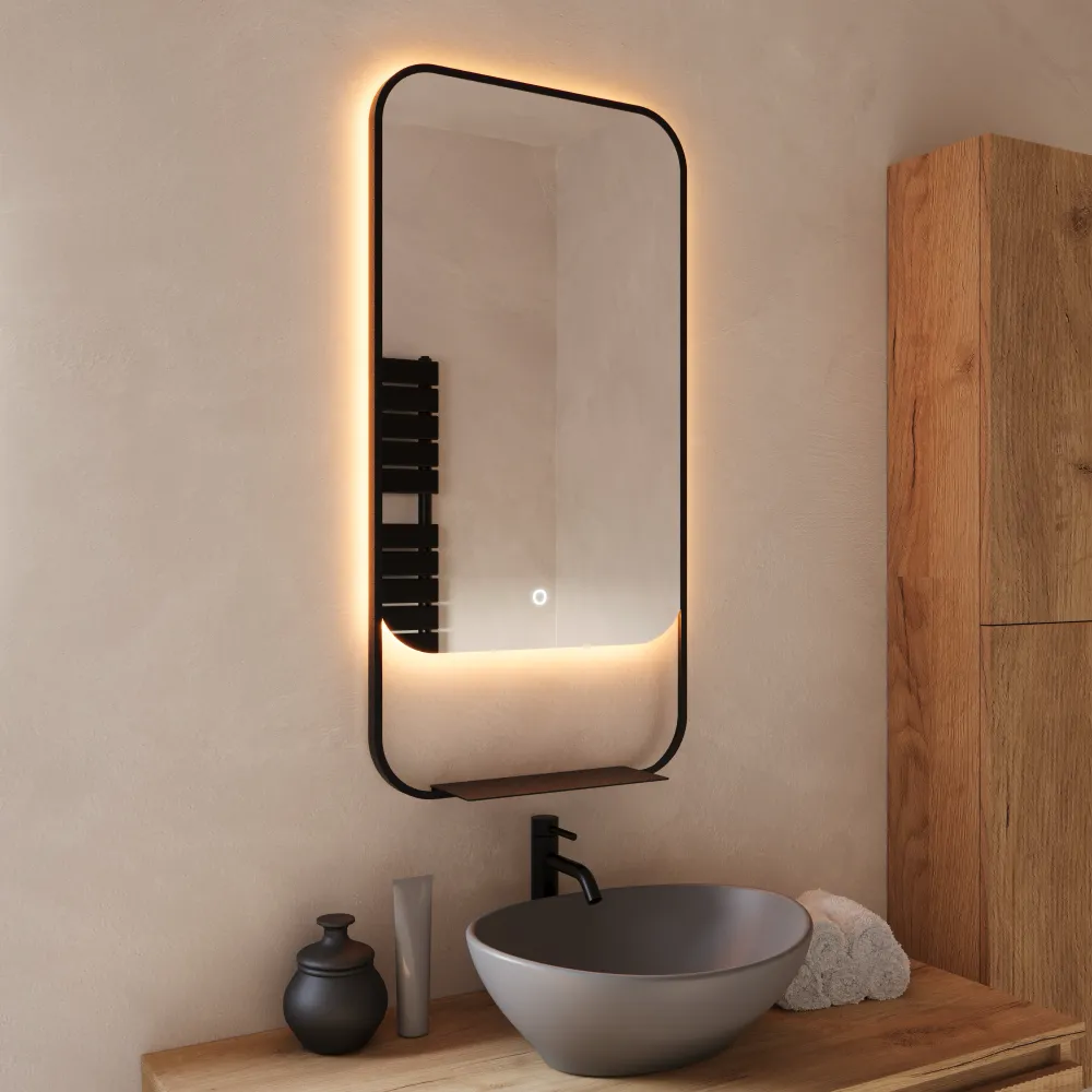 La funzionalità incontra il comfort grazie alla funzione anti-appannamento che mantiene la superficie libera da condensa. Tutte le funzioni sono gestibili in modo semplice e immediato tramite il discreto interruttore touch screen posizionato sulla superficie.