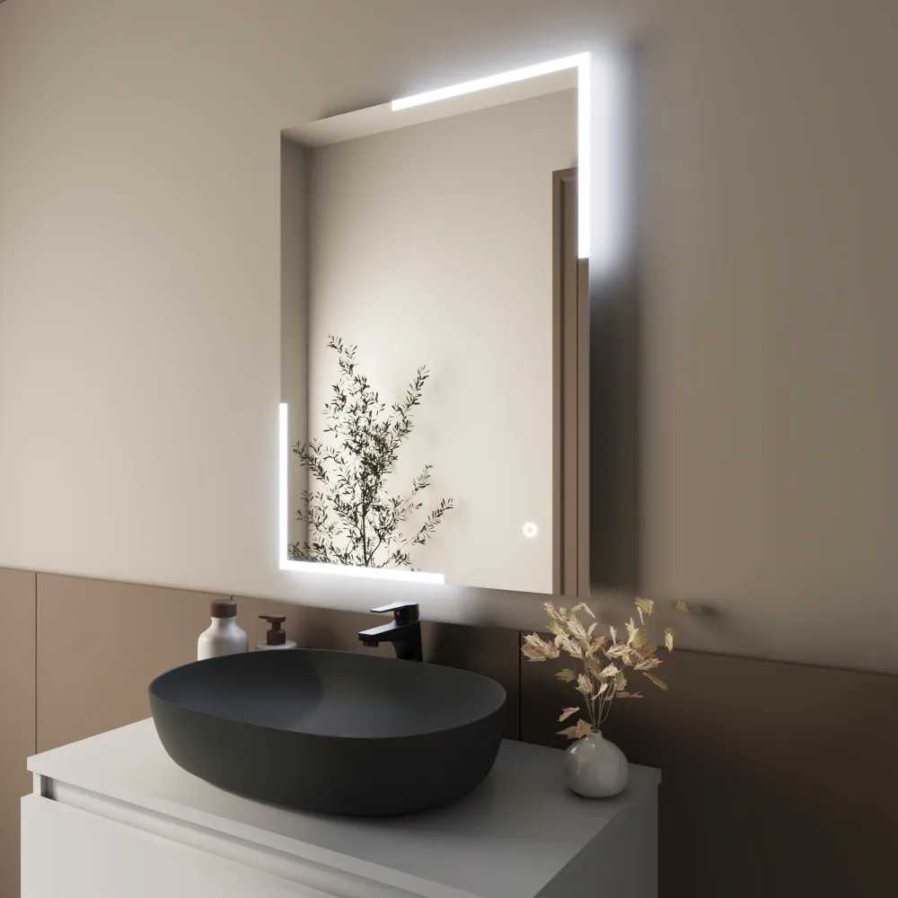Questo specchio è dotato di illuminazione Frontlit e Backlit LED, con le luci posizionate sia sul davanti che sul retro dello specchio. I LED frontali sono integrati lungo il bordo anteriore dello specchio, mentre i LED posteriori sono posizionati dietro la superficie, creando un elegante alone luminoso intorno al perimetro. Le strisce LED integrate con supporto in alluminio e copertura trasparente assicurano una distribuzione uniforme della luce e conferiscono allo specchio un design elegante e contemporaneo.