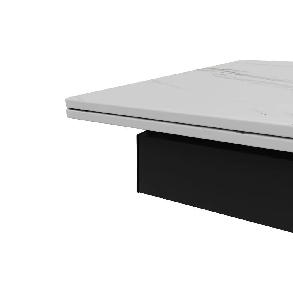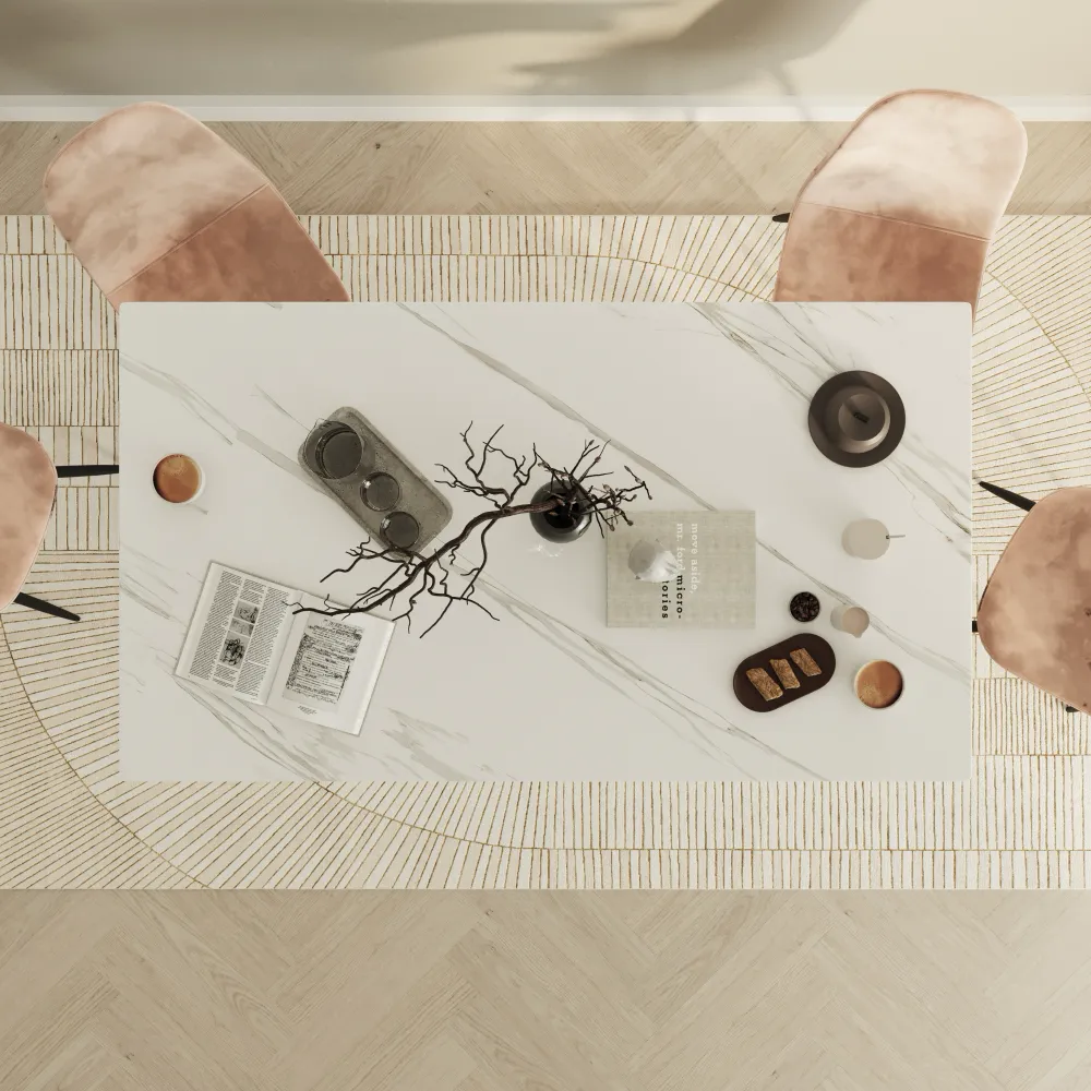 Più che un semplice tavolo, Kari è una dichiarazione di stile. Il suo design audace cattura immediatamente lo sguardo, con una base scultorea in acciaio nero che crea un gioco di linee decise e contemporanee. Questo potente cuore scuro sostiene un piano luminoso in ceramica effetto marmo, spessore 10mm, un contrasto affascinante che arreda lo spazio con personalità e un'eleganza indiscutibile.