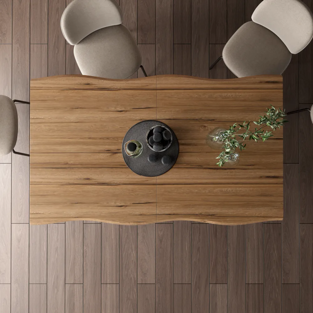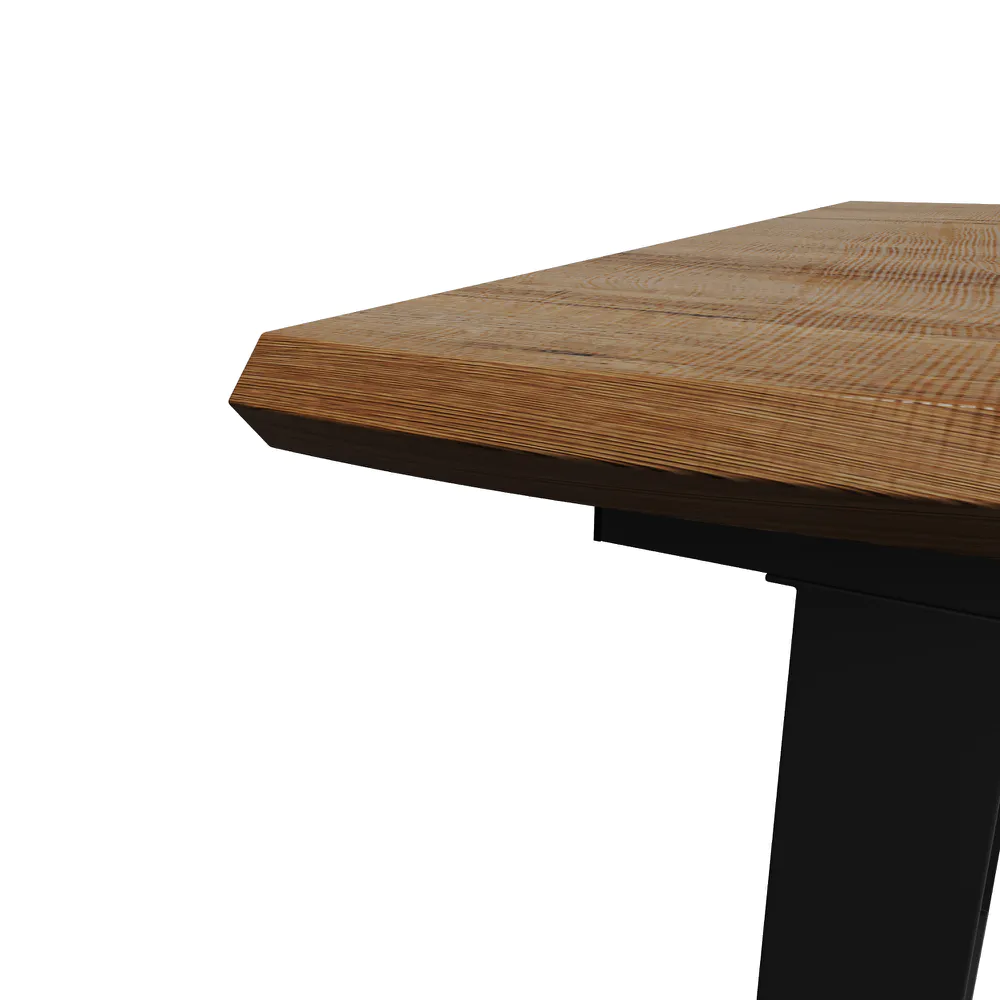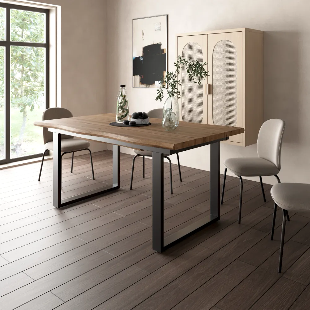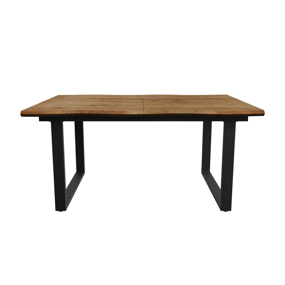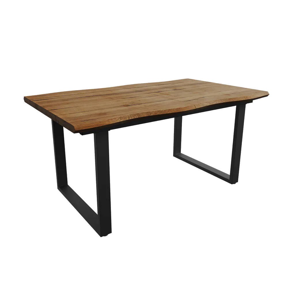 Il tavolo Lars si caratterizza per un marcato stile industriale, che unisce un robusto piano in MDF con finitura rovere scuro a una solida base in acciaio. La particolarità del top, con un importante spessore di 50 mm, sono i bordi dal profilo irregolare, che donano movimento e un aspetto naturale alla superficie. La struttura è composta da due gambe a U in acciaio verniciato a polvere nero, che assicurano massima stabilità e definiscono il look del tavolo.