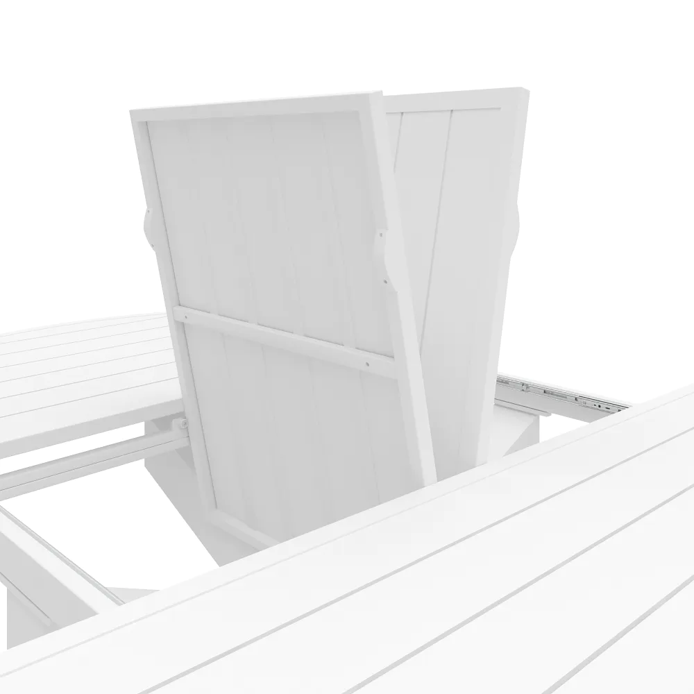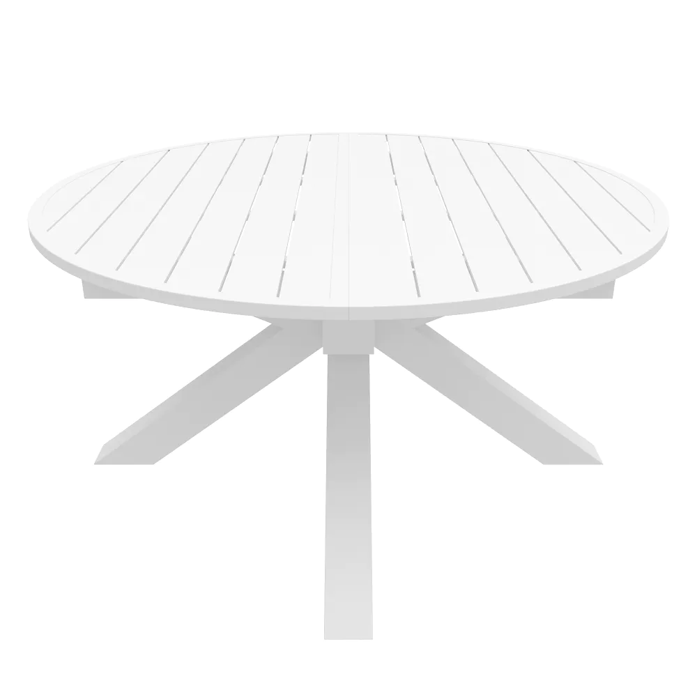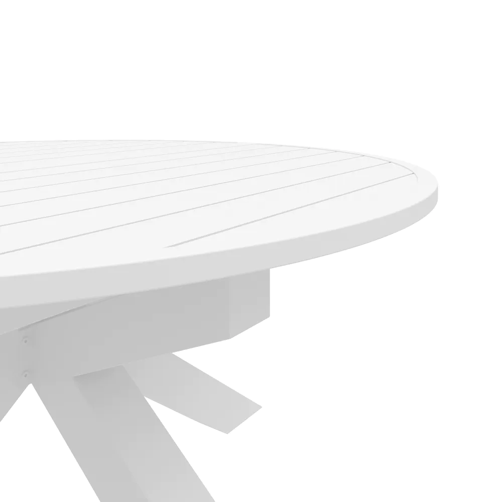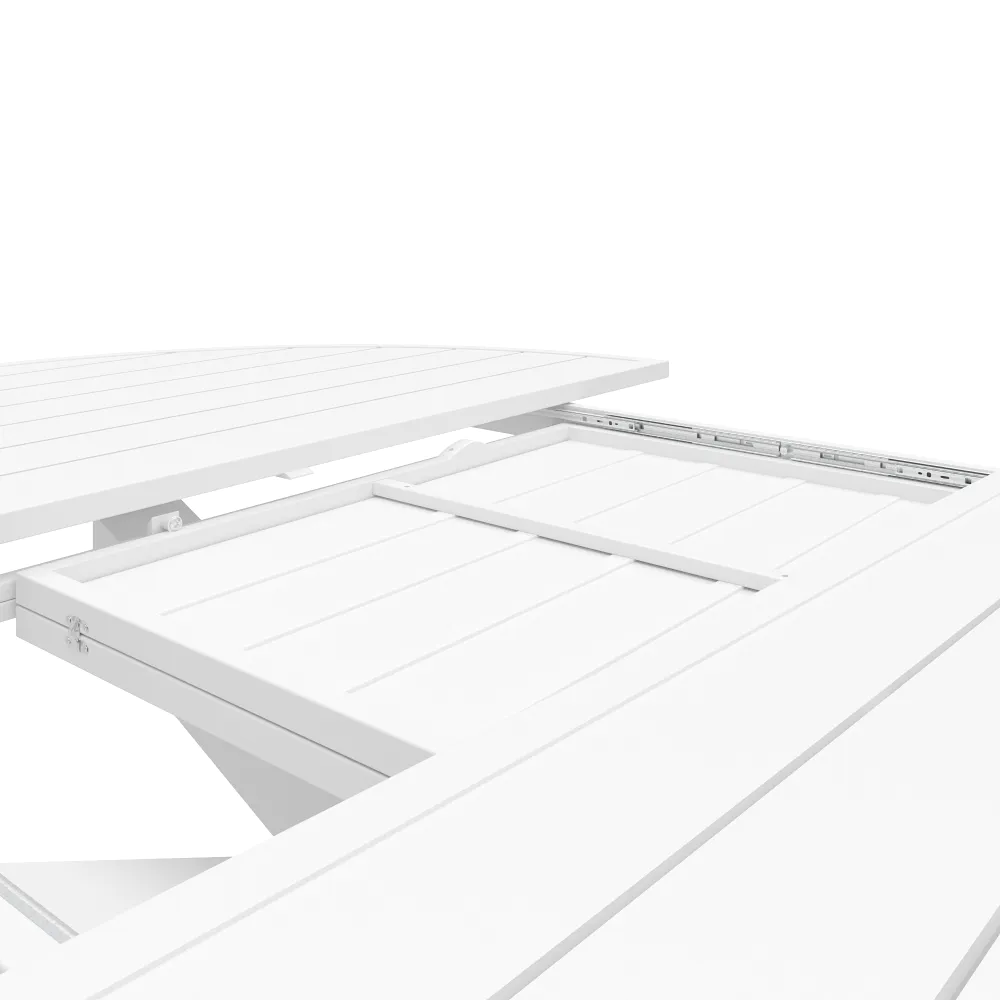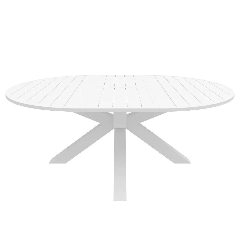 Il design è caratterizzato da un piano a doghe in alluminio, una scelta stilistica che non solo alleggerisce visivamente la struttura, ma è fondamentale per il corretto deflusso dell'acqua piovana. A sostenere il piano, posto ad un'altezza di 75 cm, troviamo una robusta base centrale a stella. Questa gamba centrale, costruita con tubolari da 10x10cm , offre due vantaggi fondamentali: assicura una stabilità incrollabile anche quando il tavolo è alla massima estensione e libera completamente lo spazio sottostante, eliminando il fastidio delle gambe per chi vi siede attorno.