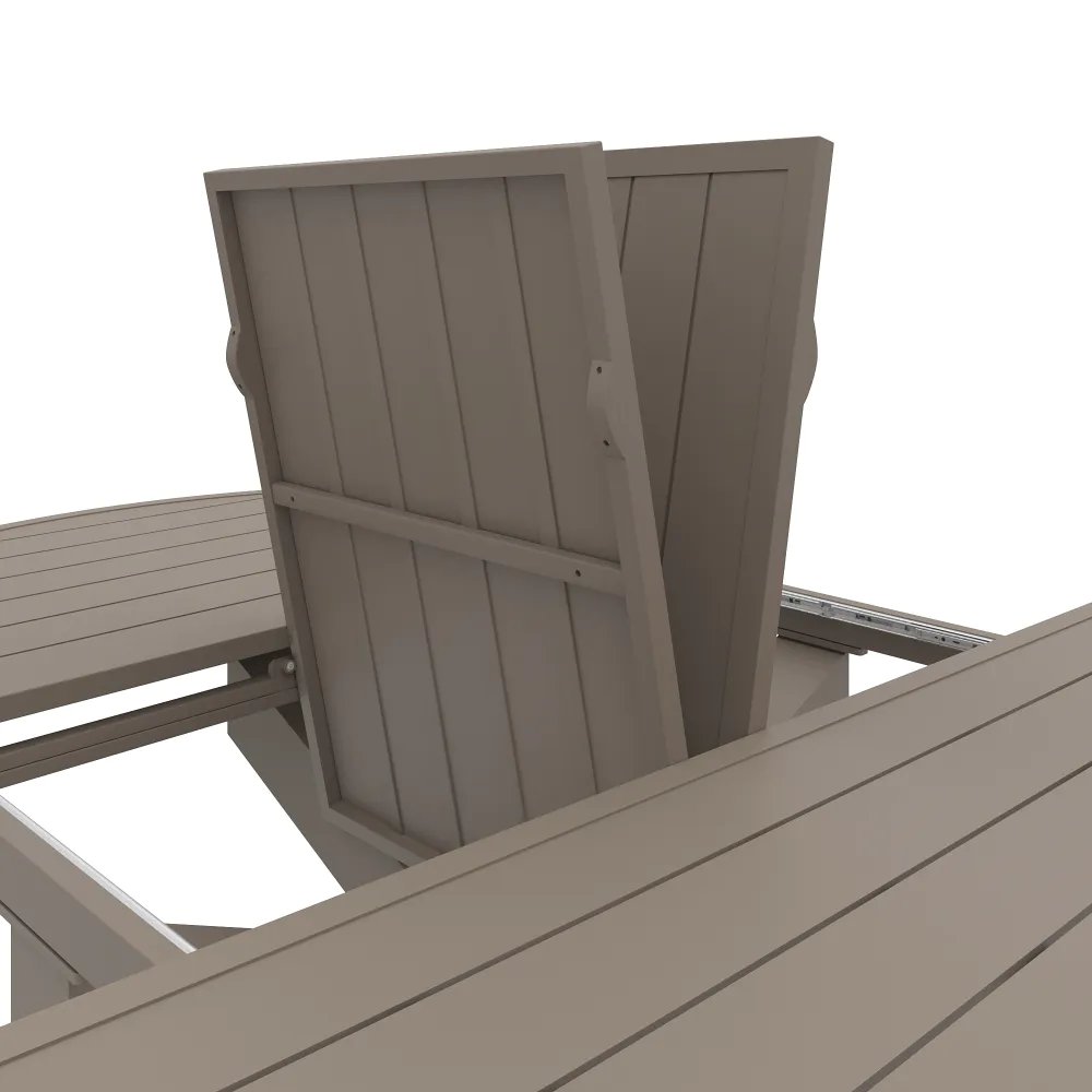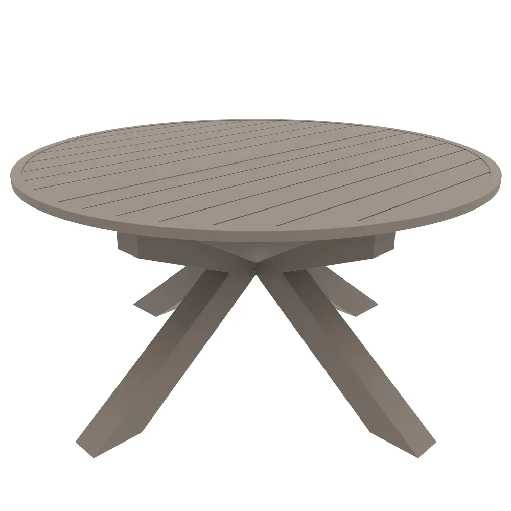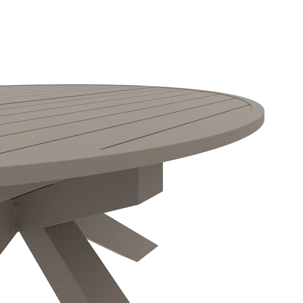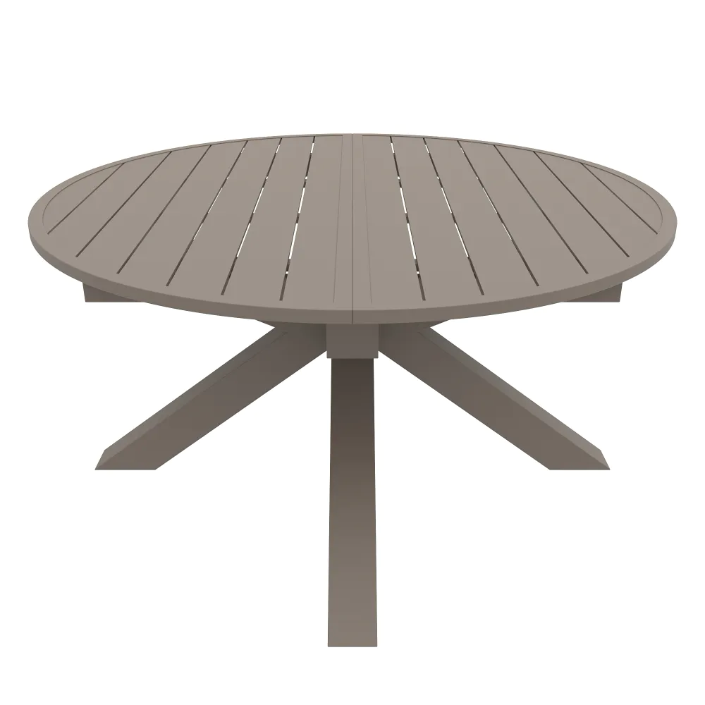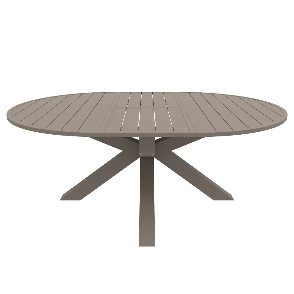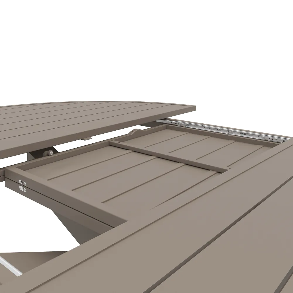 Il design è caratterizzato da un piano a doghe in alluminio, una scelta stilistica che non solo alleggerisce visivamente la struttura, ma è fondamentale per il corretto deflusso dell'acqua piovana. A sostenere il piano, posto ad un'altezza di 75 cm, troviamo una robusta base centrale a stella. Questa gamba centrale, costruita con tubolari da 10x10cm , offre due vantaggi fondamentali: assicura una stabilità incrollabile anche quando il tavolo è alla massima estensione e libera completamente lo spazio sottostante, eliminando il fastidio delle gambe per chi vi siede attorno.