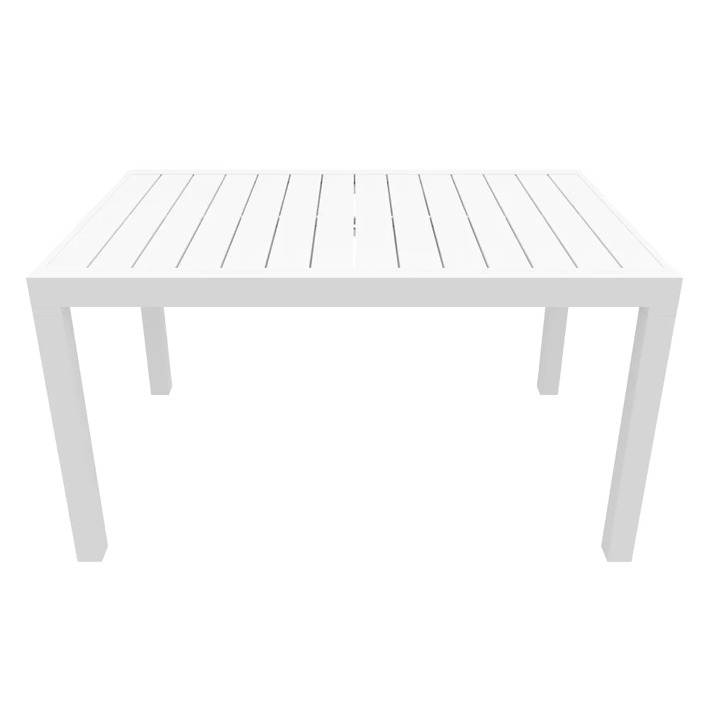 Realizzato completamente in alluminio, resiste a sole, pioggia e umidità, garantendo durata e manutenzione minima. Il piano a doghe favorisce il drenaggio dell’acqua, mantenendo il tavolo sempre asciutto e pronto all’uso. La struttura combina leggerezza e robustezza, con un design moderno e lineare che valorizza qualsiasi spazio esterno.