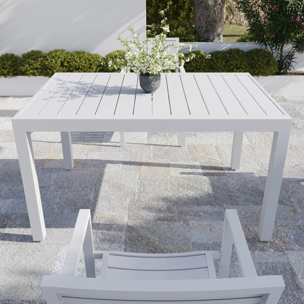La finitura bianca conferisce luminosità e si abbina facilmente a sedute di diversi stili. Il tavolo Marel è la scelta versatile e raffinata per terrazzi e giardini, capace di rendere piacevoli sia i pranzi di tutti i giorni sia le cene in compagnia, aggiungendo un tocco di eleganza discreta ai momenti all'aperto.