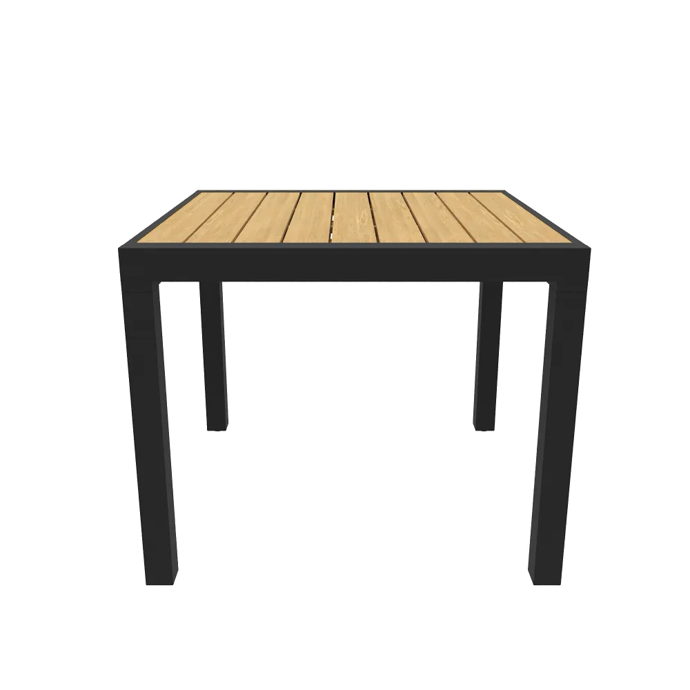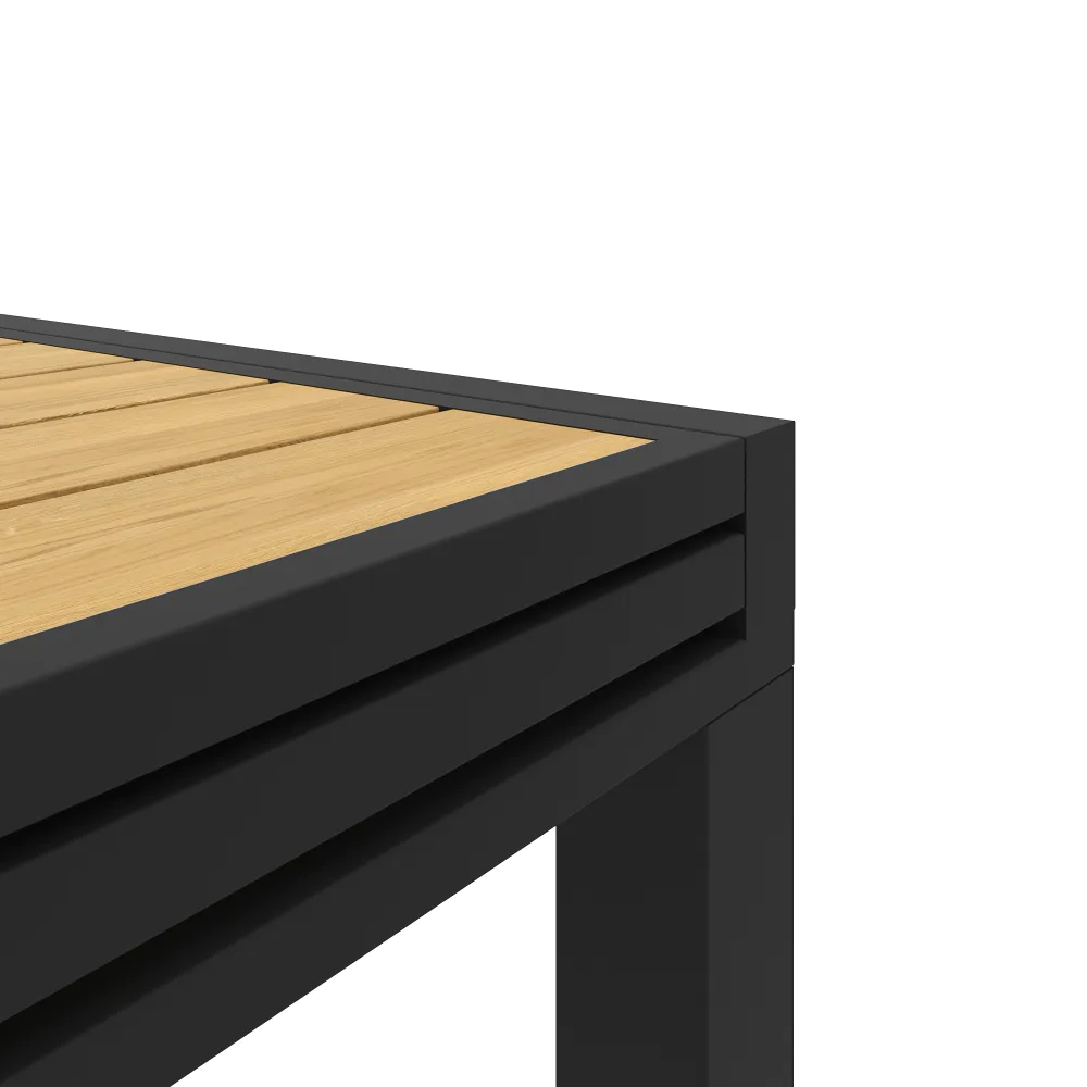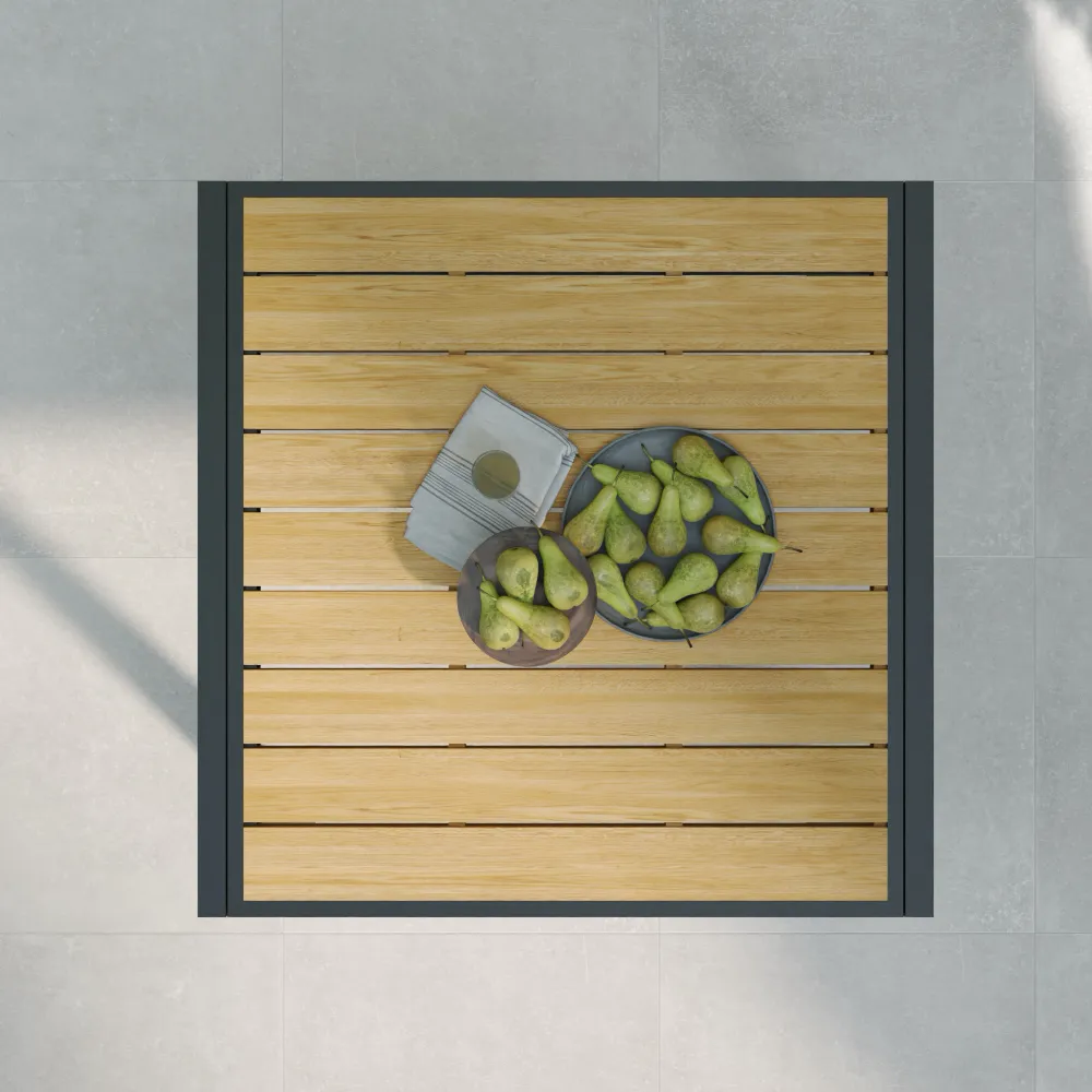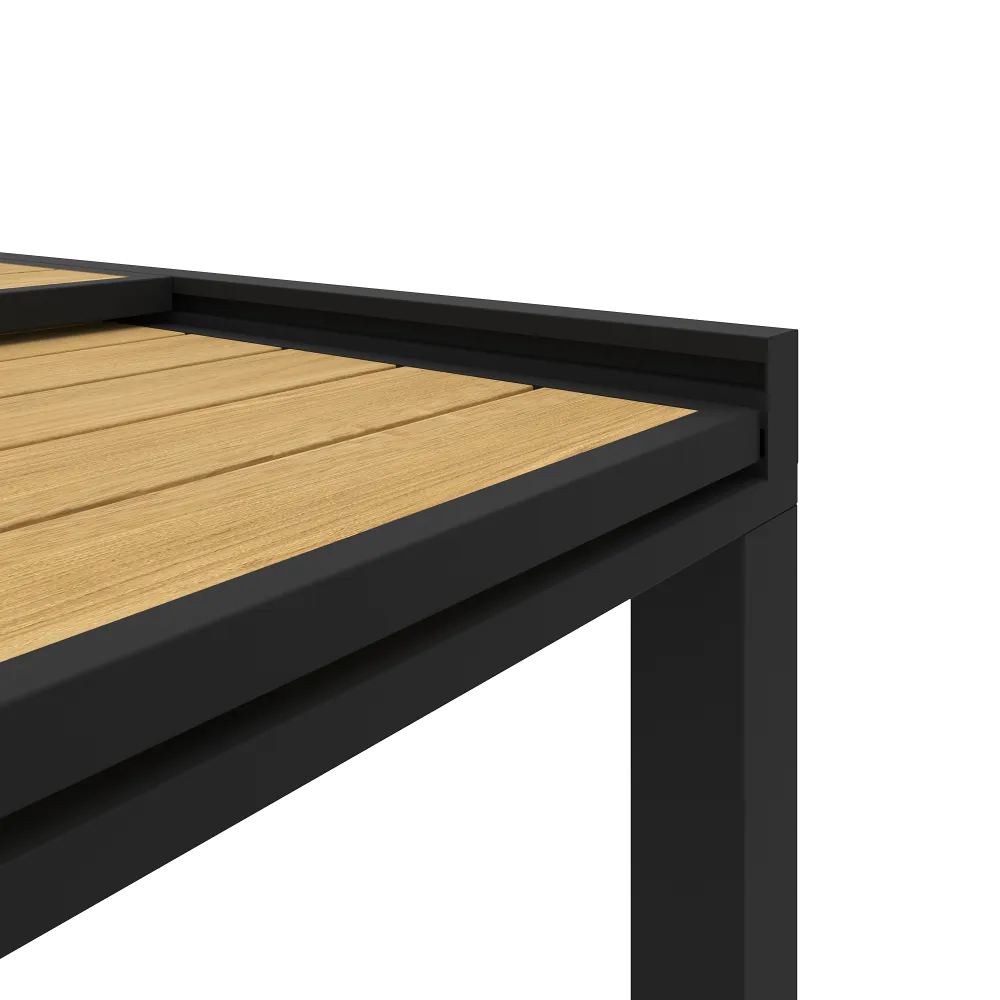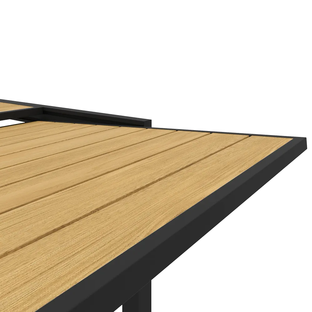 Il design si distingue per l'elegante contrasto materico: la struttura è realizzata in robusto alluminio bianco, resistente a sole e intemperie, mentre il piano è in polywood effetto legno. Questo materiale innovativo ricrea fedelmente le venature e il calore visivo del legno naturale, ma garantisce una durata superiore e zero manutenzione, non temendo l'umidità o i raggi UV.