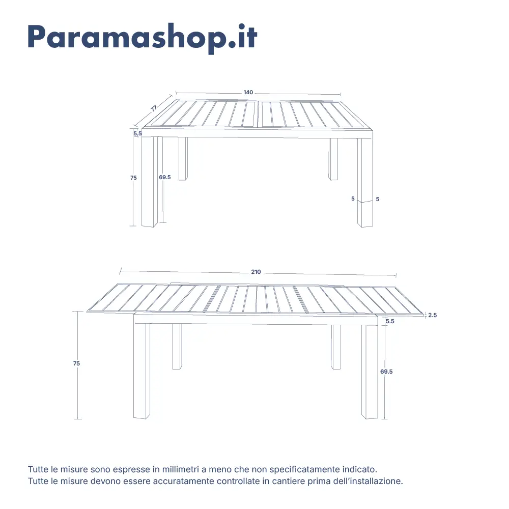 Il tavolo Marel è pensato per chi vuole vivere l'esterno senza compromessi, unendo la praticità di un tavolo compatto alla libertà di accogliere grandi compagnie. La sua vera forza risiede in un sistema di apertura che trasforma l'estetica in pura funzionalità, permettendoti di passare da una dimensione intima di 140 cm a una spaziosa tavolata da 210 cm capace di ospitare fino a 8 persone, il tutto senza alcuno sforzo.