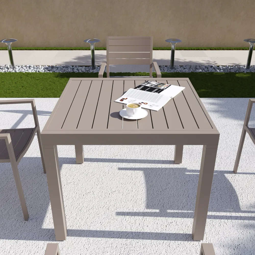 Realizzato completamente in alluminio, resiste a sole, pioggia e umidità, garantendo durata e manutenzione minima. Il piano a doghe favorisce il drenaggio dell’acqua, mantenendo il tavolo sempre asciutto e pronto all’uso. La struttura combina leggerezza e robustezza, con un design moderno e lineare che valorizza qualsiasi spazio esterno.