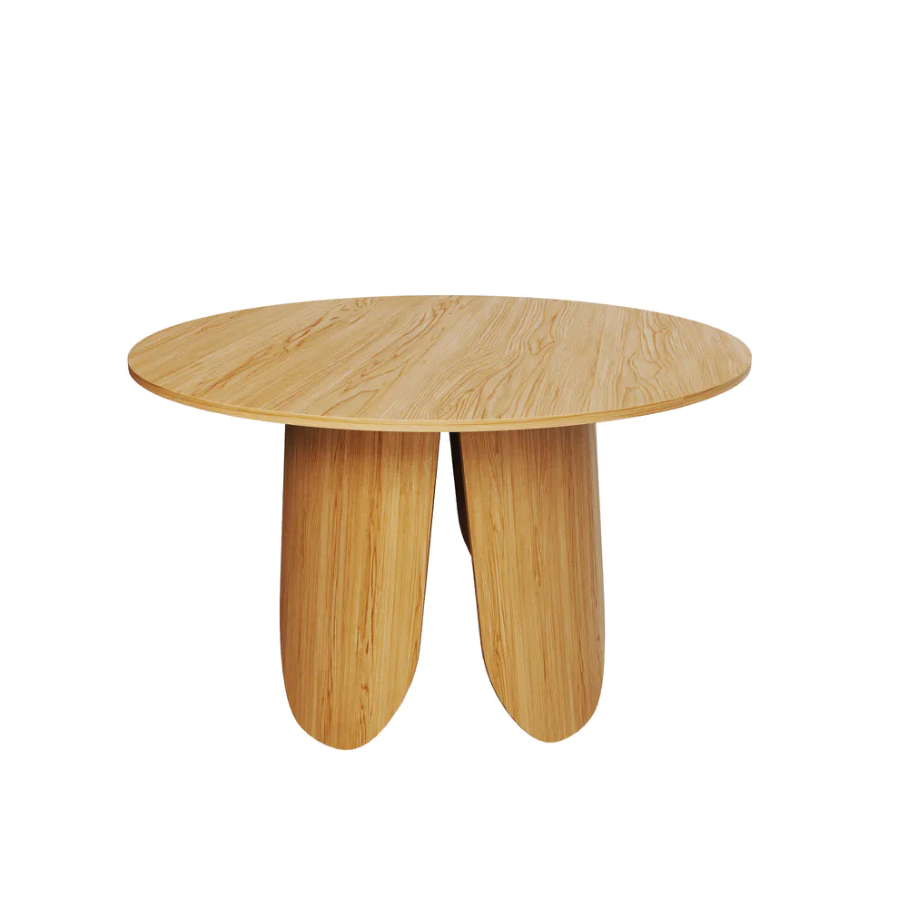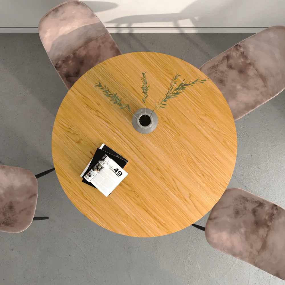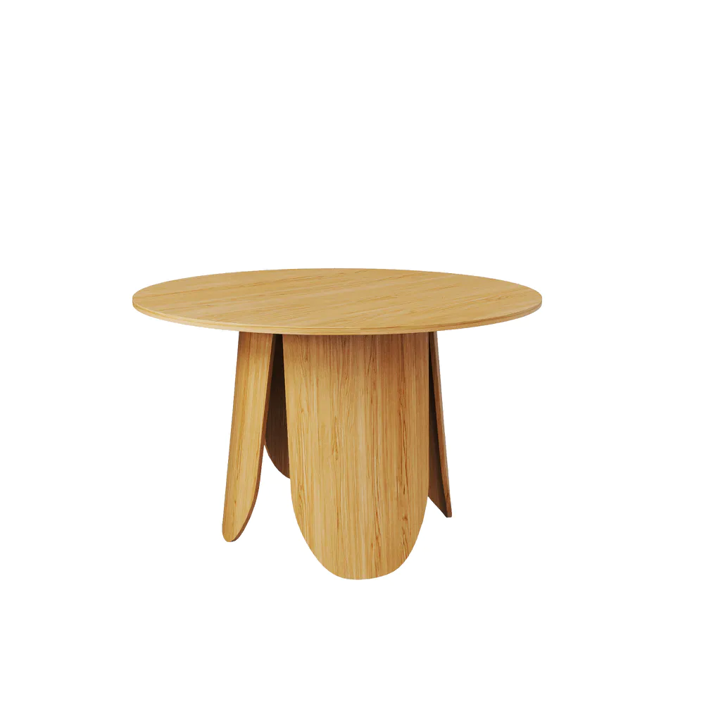 Il tavolo Einar nasce da un'idea di design pura e continua, dove la forma diventa la vera protagonista. La sua base è il cuore del progetto: quattro ampi petali, realizzati interamente in MDF, si aprono verso l'esterno creando un gioco di curve morbide e di spazi vuoti che cattura lo sguardo. Questa scultura, rifinita con un delicato effetto legno chiaro che ne riveste ogni superficie, sostiene con armonia un piano perfettamente rotondo.